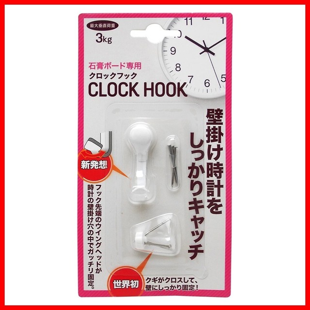 【商品名】 日軽産業 フック クロックフック MT-50W 奥行1.3×高さ3.4×幅0.8cm キャップ1個、取付ピース1個、予備クギ3本 0523-255 【商品説明】 原産国:フック・キャップ/中国、取付ピース・予備クギ/日本 材質:フック/鉄(ポリエステル樹脂塗装)、キャップ/ABS樹脂、取付ピース/ABS樹脂、予備クギ/ステンレス 入数:フック/1コ、キャップ/1コ、取付ピース/1コ、クギ/3本 最大垂直荷重:3kg 用途:壁面用 取り付けられる所:クロス貼りの石膏ボード壁(9mm以上)、薄ベニア(5mm以上)(ベニヤなどの木質新建材にはハンマーをご用意ください) 取り付けられない所:コンクリート、レンガ、タイルなどの固い壁、土壁、しっくいなどのもろい壁、吸音ボード 壁掛け時計をしっかりキャッチ(石膏ボード専用) 新発想! フック先端のウイングヘッドが時計の壁掛け穴の中でガッチリ固定 世界初! クギがクロスして、壁にしっかり固定!