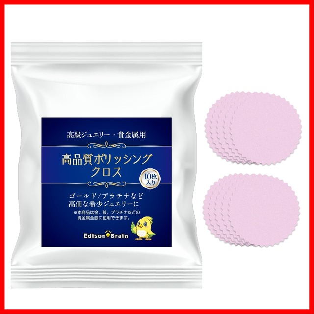 【商品名】 EdisonBrain 金 銀 プラチナ ジュエリー 艶出し クロス 8cm ポリッシング 貴金属 アクセサリー 磨き シルバー お手入れ 汚れ落とし リフレッシュ (10枚セット) 【商品説明】 ジュエリー磨きにピッタリのクロスセット:金や銀、プラチナなどのジュエリーを磨きたい時にご活用いただける円形のジュエリークロス10枚セットです。表面の小さな傷を消して、ジュエリー本来のツヤ感を取り戻すことが出来ます。 予備のクロスもたくさん用意できる:こちらの商品は10枚セットですので、予備のジュエリークロスもたくさん用意することができます。磨いてツヤ感を取り戻したいジュエリーがたくさんある場合でも使える大容量セットです。 サイズが大きめで磨きやすい:こちらのジュエリークロスのサイズは大きめですので、ネックレスやブレスレットなどのジュエリーも磨きやすいです。※メッキ加工が施されたジュエリーやカメラのレンズなどには使用できませんので、ご注意ください。 大切なジュエリーをピカピカに磨ける:ジュエリー本来のツヤ感を取り戻し、ピカピカに磨けるジュエリー専用のクロスですので、大切な結婚指輪などのお手入れをしたい場合にピッタリです。大切なジュエリーを磨きたい時にぜひ活用してみてはいかがでしょうか。