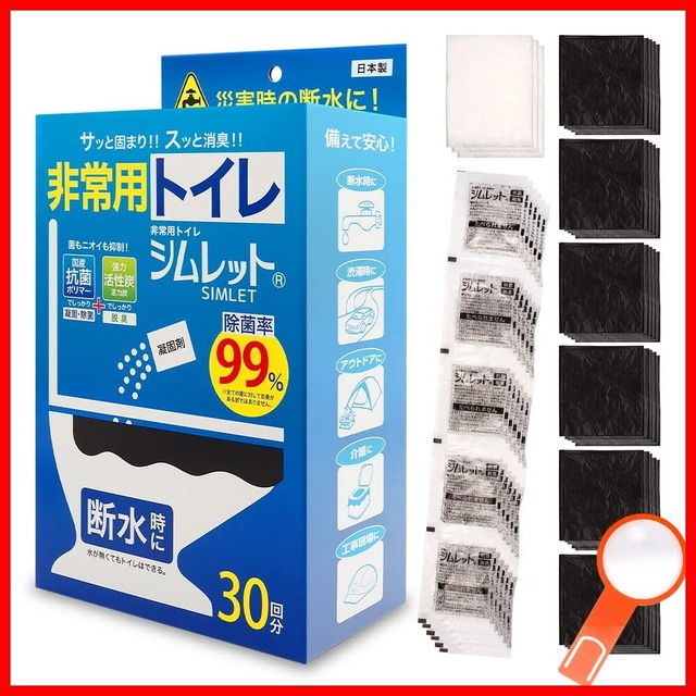 【商品名】 携帯トイレ シムレット 非常用 防災グッズ 抗菌 消臭 凝固剤10年保存 日本製 しおり型ルーペ付 (30回分) 【商品説明】 「急な断水でトイレが使えなくなった!」 「最近地震や災害が多くて、何か準備をしないと不安かも…」 「災害用の持ち出しリュックを用意したいけど、何が必要?」 万が一の時、トイレが使えなくなると本当に困りますよね。 いざという時にあると助かる簡易トイレ「シムレット」のご紹介です。 非常事態になった時、不便だったという声が多いのが「トイレ」。 東日本大震災ではトイレ難民が約82万人も出ました(中央防災会議の専門調査会調べ)。 避難所に仮設トイレが一週間以内に設置された自治体は約半数と、必ずトイレに行けるとは限りません。 また、設置された仮設トイレが不衛生で、トイレに行くのを我慢して体調を崩してしまう可能性も… 自宅避難の場合でも、水道等のライフラインが止まると水洗トイレは使えなくなってしまいます。 防災用品を準備する際、食料等とともに携帯トイレも必ず用意しておきたいですね。 「シムレット」は、洋式トイレに設置するタイプの非常用トイレ。 便座にトイレ袋をセットし、用を足した後に凝固剤をふりかけるだけ。 排泄物は約22秒で固まり、使用後はトイレ袋ごとゴミとして捨てられます。 10年間保管が可能なので、長期備蓄しておけるのもメリットです。 何かとストレスが多い非常時も「シムレット」なら安心。 国産抗菌ポリマー使用で、99%という高い除菌率を発揮します。 高機能活性炭の強力な脱臭効果で気になる臭いもカット。 こまめに掃除ができない状況でも、トイレを快適に使うことができます。 災害時以外にも、アウトドアやキャンプ、介護用にもおすすめ。 渋滞時や車中泊に備えて車の中にも用意しておくと安心です。 お子様からお年寄りまで簡単に使える「シムレット」、ぜひ防災用品に加えてください。 ※ご準備の目安/お一人、1日7~8回の排泄が標準です。3日分の備蓄を目標にご準備ください。 ●セット内容/凝固剤、トイレ袋(縦60cm×横65cm)、廃棄用袋(縦80cm×横60cm) ●凝固剤材料/抗菌吸水ポリマー、高機能活性炭 ●内容量(1包あたり)/7g ●吸水量(1包あたり)/約420cc ●保管可能年数/製造日より10年 ●原産国/日本 【使用方法】 1.便器と便座の間にトイレ袋をはさみ、便座をのせて固定します。 2.排泄後、凝固剤の中身をふりかけると固まります。 3.トイレ袋を取り出し、袋をしっかり結んで廃棄してください。 ※使用後のトイレ袋は廃棄袋にまとめ、できるだけ早く廃棄してください。 ※トイレ袋が濡れるのが気になる場合は、廃棄用袋を便器にはさんでからトイレ袋をセットしてください。