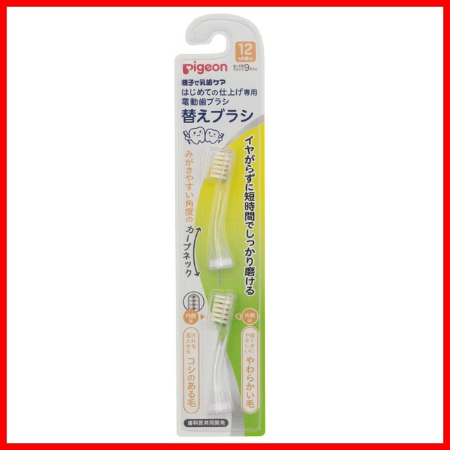 【商品名】 ピジョン はじめての仕上げ専用電動歯ブラシ 替えブラシ (12ヵ月頃から) ピジョンの電動歯ブラシ共通で使用可 【商品説明】 ママ・パパがやさしくみがいてあげる、「ピジョンはじめての仕上げ専用電動歯ブラシ」の替えブラシ※です。 対象月齢:12ヵ月頃~(歯の本数の目安:9本~) 【「2種類の植毛ブラシ」で汚れをしっかり落とします】2種類のかたさの植毛ブラシで効率的に奥歯の汚れまでしっかり落とします。 ブラシの内側(色の付いた部分)は清掃効果の高いコシのある毛を、外側には歯ぐきをキズつけにくいやわらかい毛を採用。 【小さなお口にぴったりな「薄型ヘッド」】ブラシの先端が薄型なので、赤ちゃんの小さなお口のなかもみがきやすい。 【みがきやすい角度の「カーブネック」】ブラシの形状がみがきやすい角度にカーブしているので、狙った場所にも届きやすい。 ●2種類のかたさの植毛ブラシで効率的に奥歯の汚れまでしっかり落とせる。 ●外側は子どもがイヤがらないやわらかい毛、内側は汚れを落とせるコシのある毛。 ●小さなお口にぴったり薄型ヘッド ●みがきやすい角度のカーブネック ●歯科医と共同開発 ※この替えブラシは、「ピジョンはじめての仕上げ専用電動歯ブラシ」専用です。 本体の取扱説明書をよくお読みのうえ、正しくご使用ください。 【仕上げ用ブラシのお取り替え目安】 仕上げ用ブラシは消耗品です。毛先が広がったり、ブラシ部の汚れが目立ってきたら仕上げ用のブラシの交換をしてください。 安全警告 小さなお子様が誤って飲み込まないよう、必ず保護者の監督下でご使用ください。