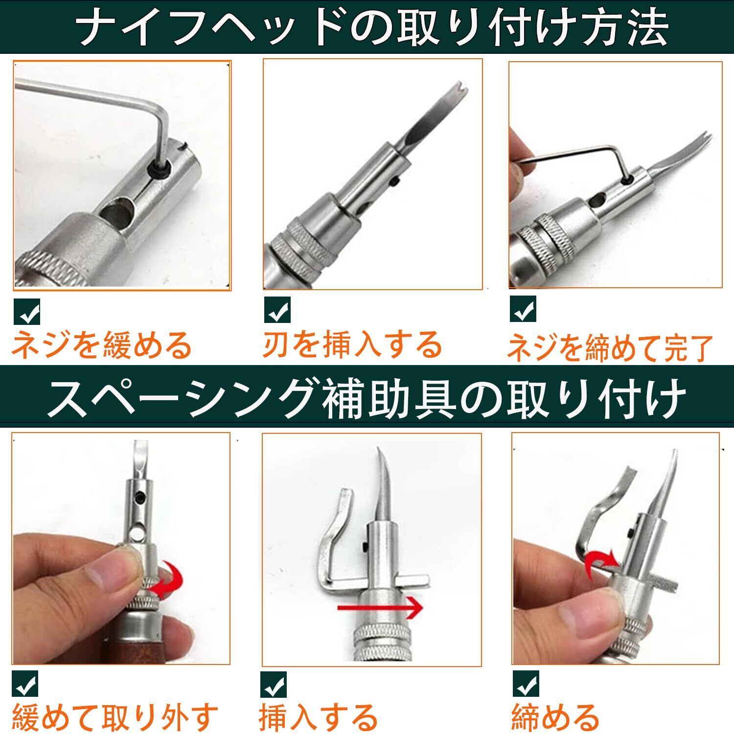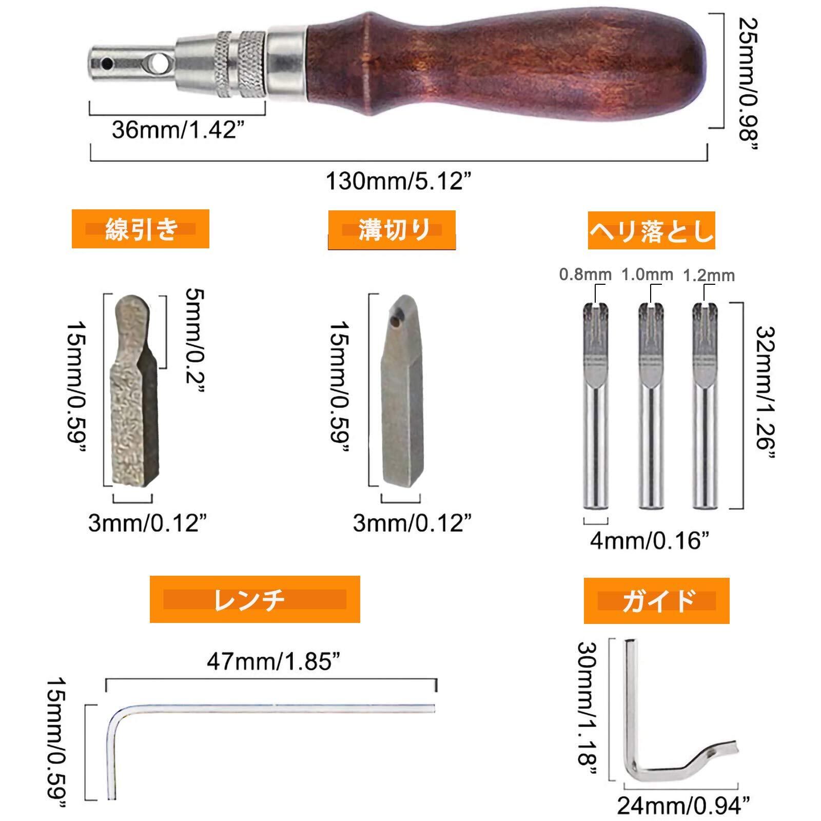 【セット内容】溝切り用1個、線引き用1個、へりおとし用3個(0.8mm/1.0mm/1.2mm3種類の替え刃)、レンチ1個、ガイド1個