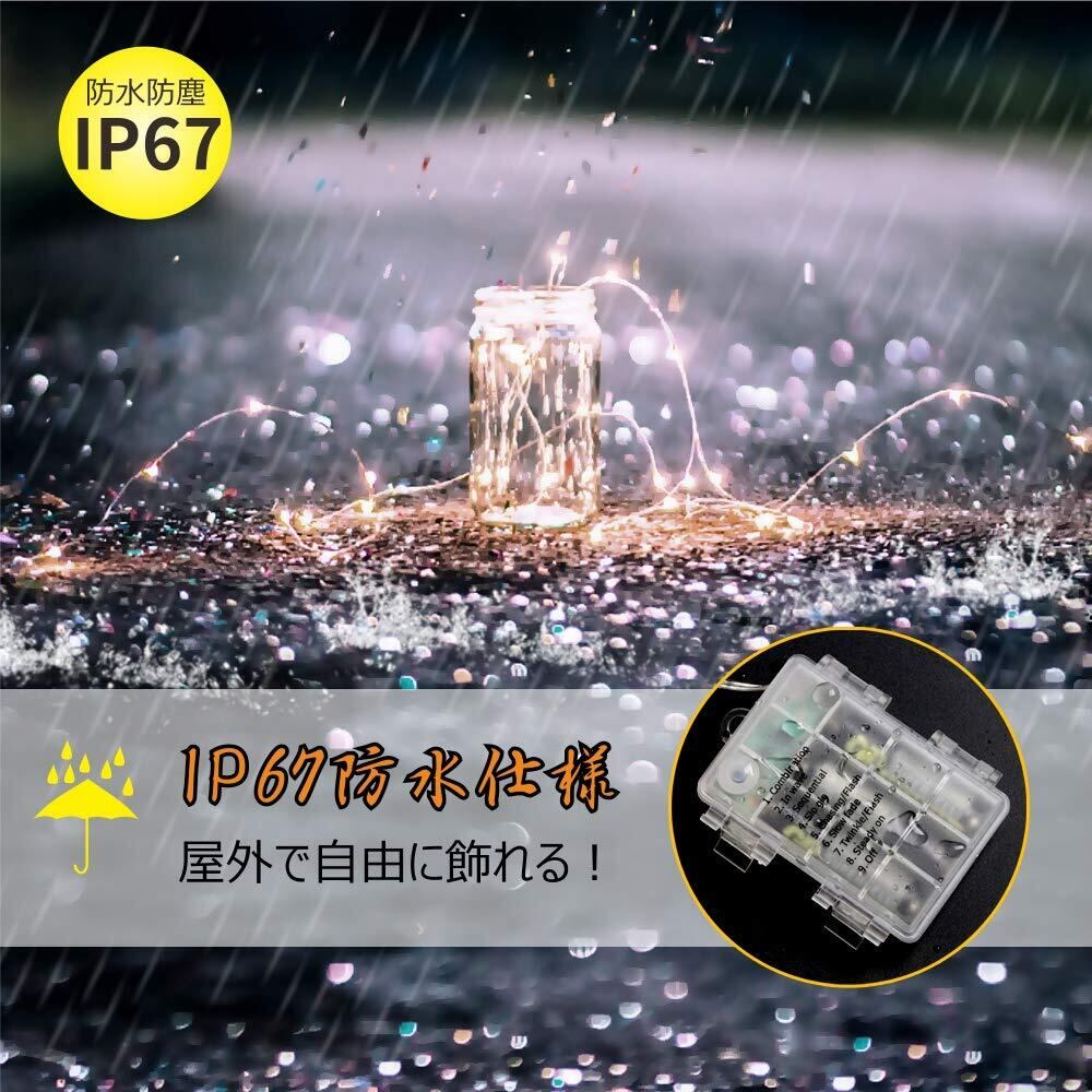 ✩【防水&防塵仕様】ストリングスライトはIP67防水なので、屋外での使用可能!庭や部屋やクリスマスツリーなど色々な場所で飾られます!クリスマス街にイルミネーションライトが飾られ、暖かい冬をロマンチックに演出する!電池ボックスの蓋にはパッキンがあり水やホコリをシャットアウトします。ご注意:防水ですが、水の中に入れるなどの極端な環境でのご使用はできません。