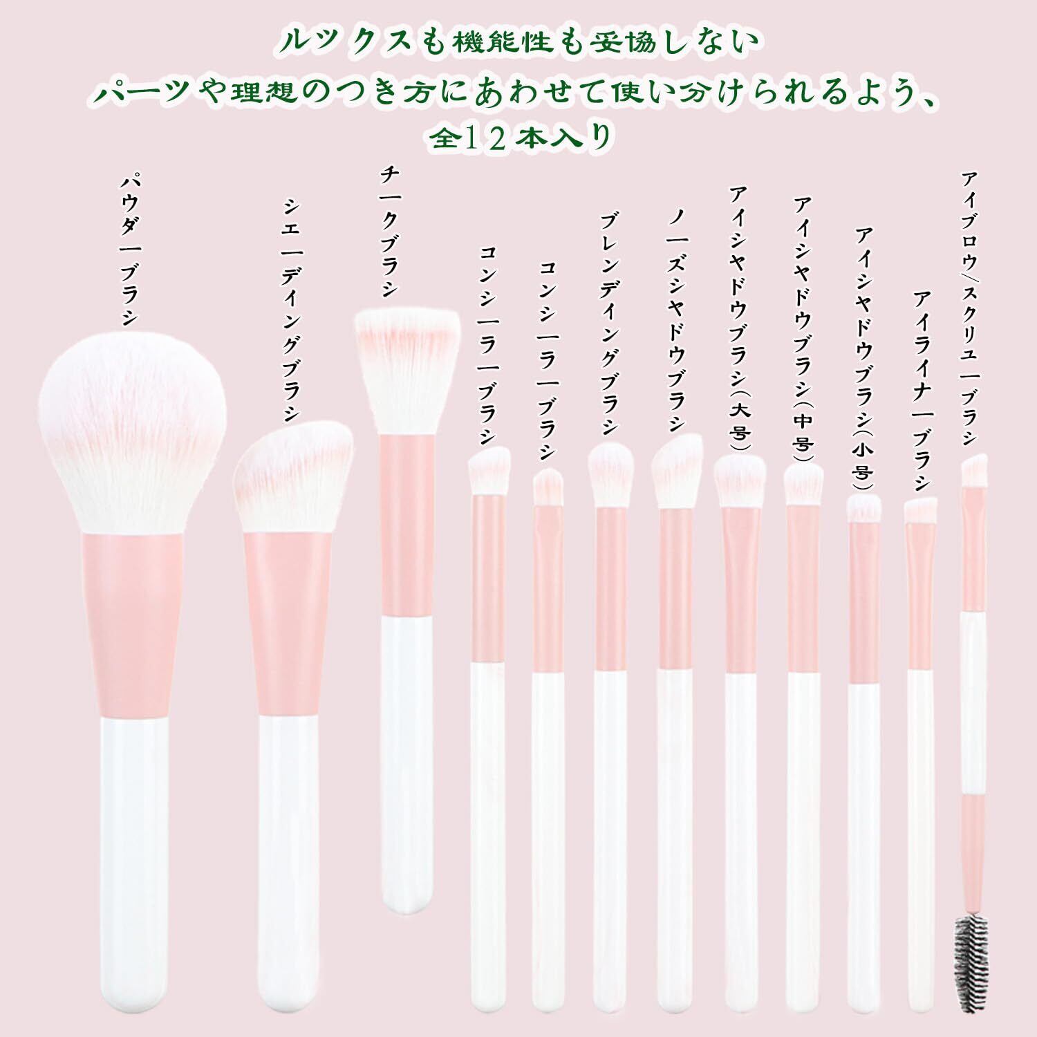 【12本メイクブラシセット】商品には、パウダーブラシ、ファンデーションブラシ、チークブラシ、輪郭ブラシ、アイシャドウブラシ、アイラインブラシが含まれ、毎日のメイクアップに必要な道具がそろっています。この一セットで十分、日常メイクからフルメイクまで、お化粧に必要な化粧筆をほぼ全てお入れしました。