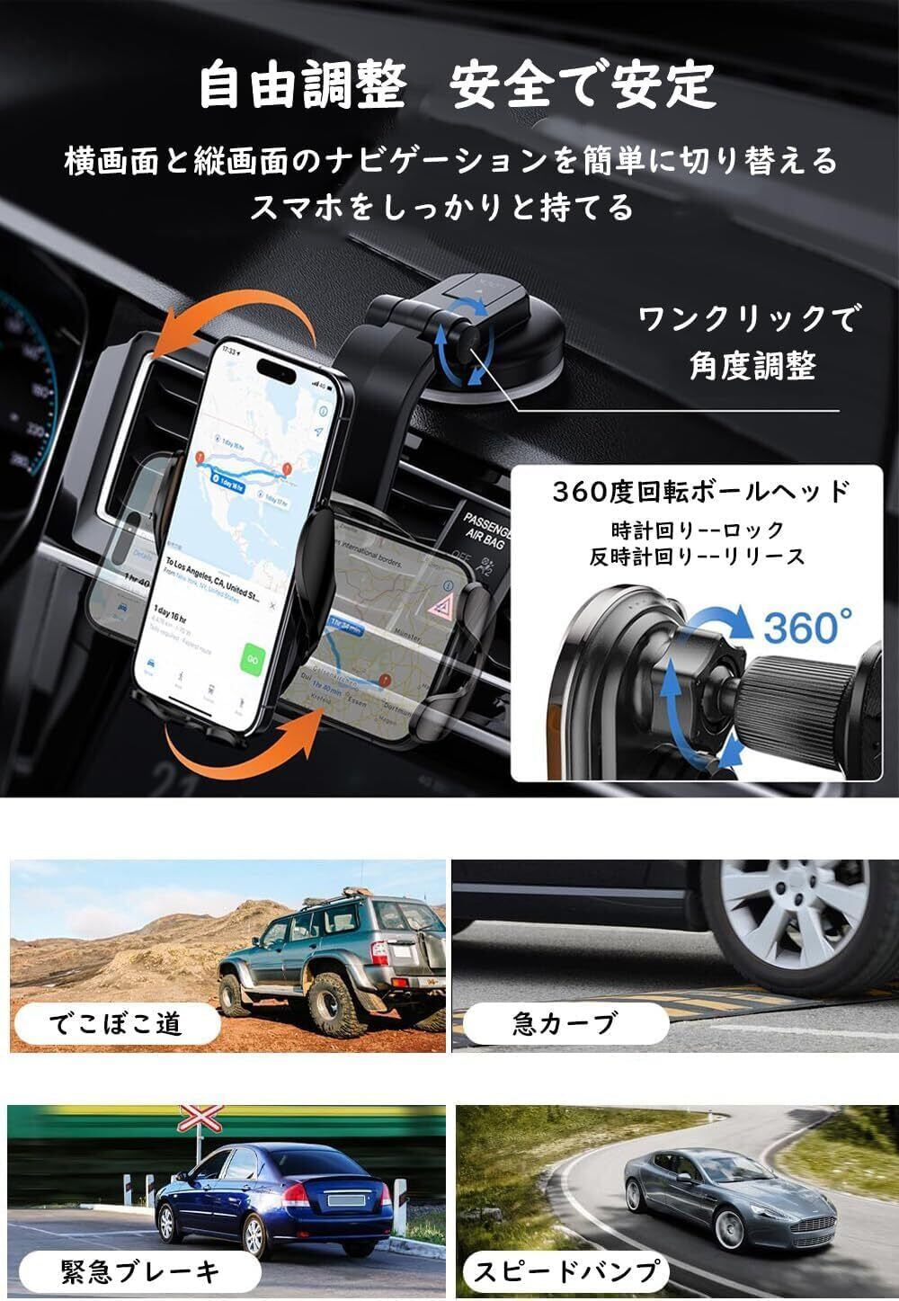車載ホルダー スマホホルダー 15W 急速ワイヤレス充電器 車ホルダー自動開閉 360度回転 吸盤式&吹き出し口2種類取り対応 iPhone/Sony/SHARP/for Samsung/Xiaomi/OPPO など