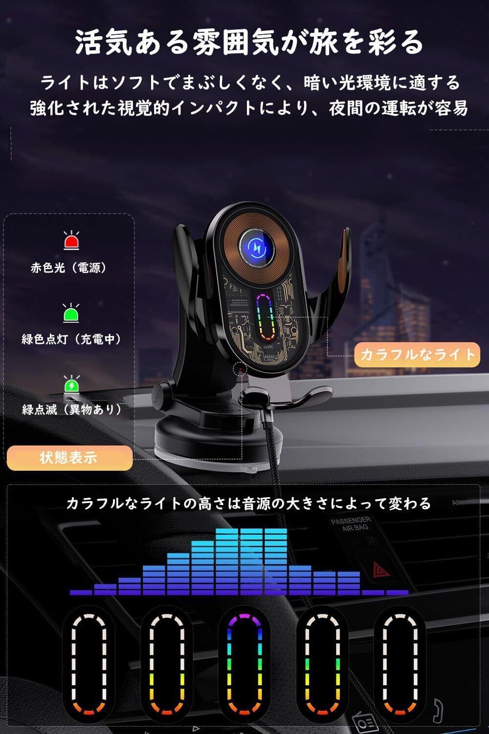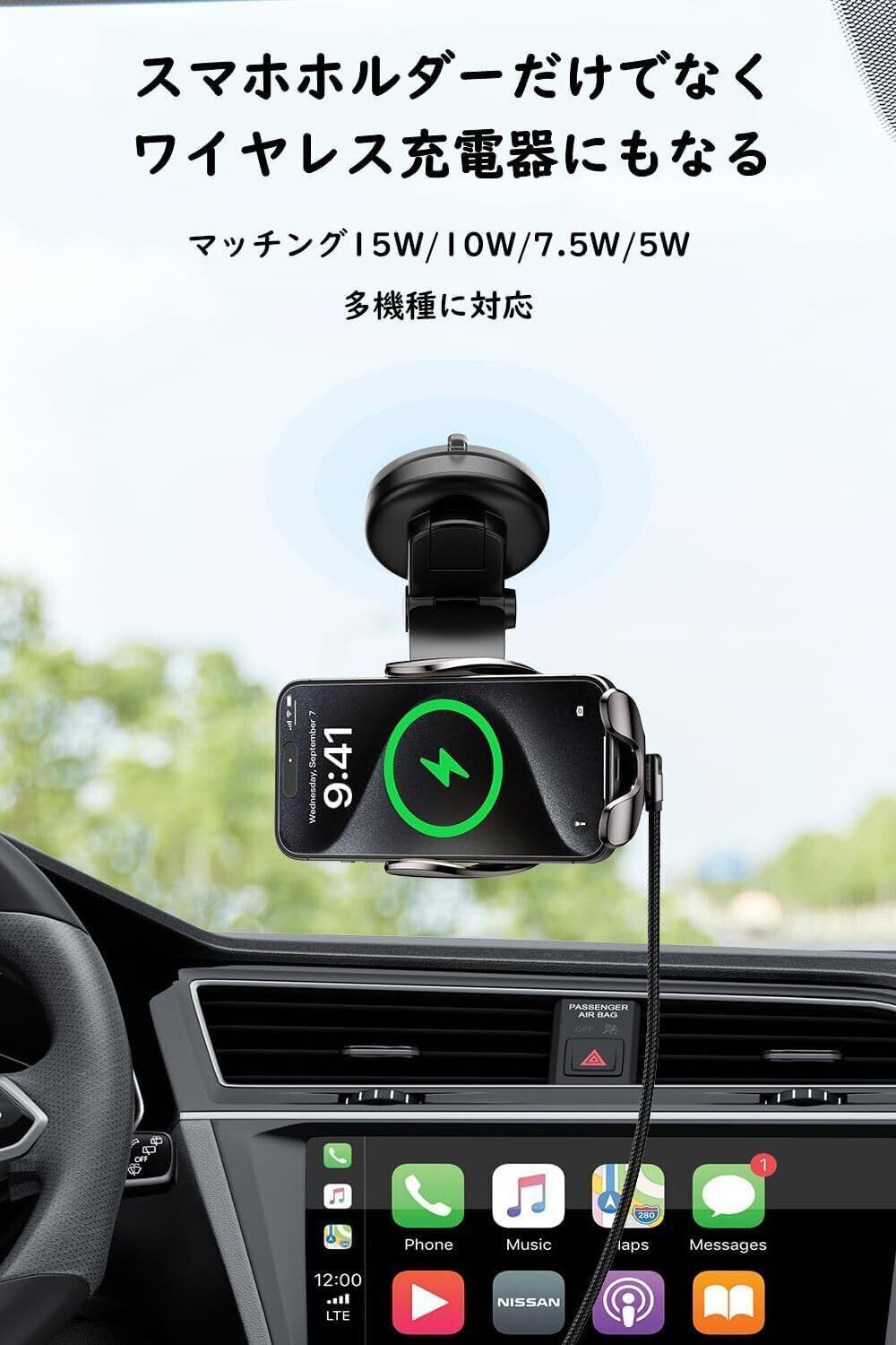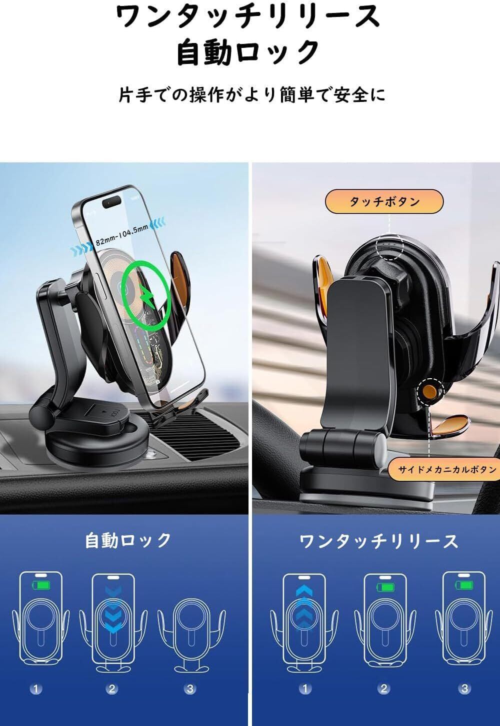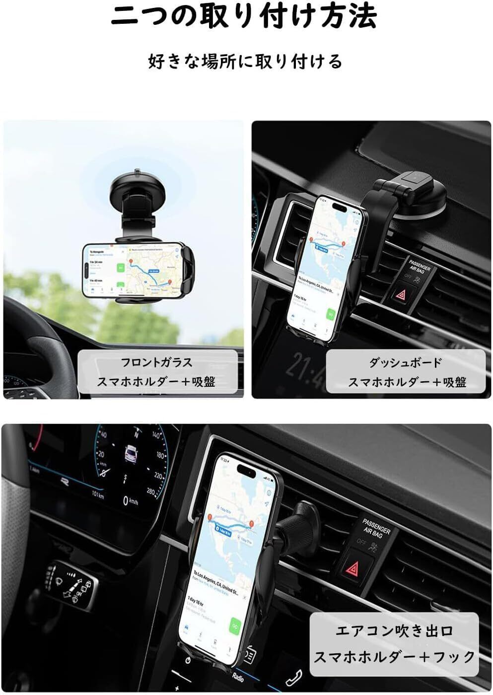 15Wの高出力ワイ15W 高速ワイヤレスカーチャージャー: ワイヤレスカーチャージャーマウントは、外出先で Qi 対応スマートフォンを効率的かつ安全に充電し、電力出力を最適化します。for LG V50/V40/V30/G8/G7 用の 15W ワイヤレス高速充電、for Samsung Galaxy S24 Ultra/S23/S22/S21/Note 10+ 用の 10W、for iPhone 15/14/13/12 Pro Max/11/XS Max/XS 用の 7.5W、その他の電話用の 5W 標準ワイヤレス充電。注: 15W/10W/7.5W 高速充電には QC 3.0 カーチャージャー (付属していません) が必要です。USB-C 充電ケーブル 1 本が含まれています。ヤレス充電器搭載で、スマートフォンを素早く充電できます。