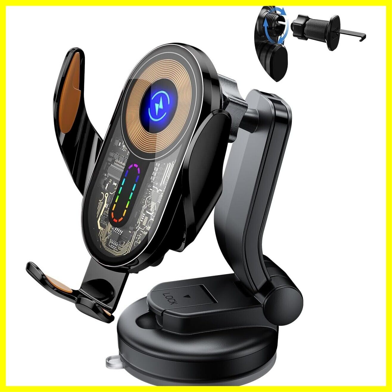車内でスマートフォンを快適に使用できる便利なホルダーです。ワイヤレス急速充電機能を搭載し、15Wの高出力で素早く充電できます。自動開閉機能と360度回転機能により、様々な角度から操作が可能です。吸盤式と吹き出し口の2種類の取り付け方法に対応しているので、車内の好きな場所に設置できます。iPhone、Sony、SHARP、Samsung、Xiaomi、OPPOなど、主要なスマートフォンに対応しています。スマホを見やすい位置に固定でき、ナビゲーションアプリの利用や動画視聴に最適です。車内の必需品として、ドライビングをサポートします。
