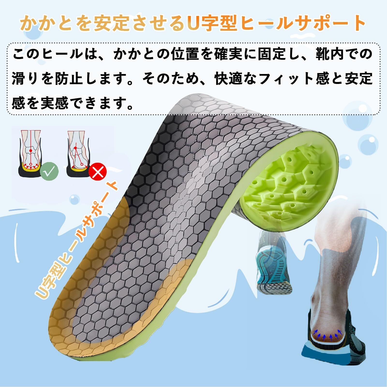 【歩行の快適性が向上】中敷きはクッション性があり、歩く際に足への負担を軽減します。これにより、普段の移動やアクティビティが一段と快適になります。特に長距離の歩行時、足にかかるストレスを感じにくくなります。