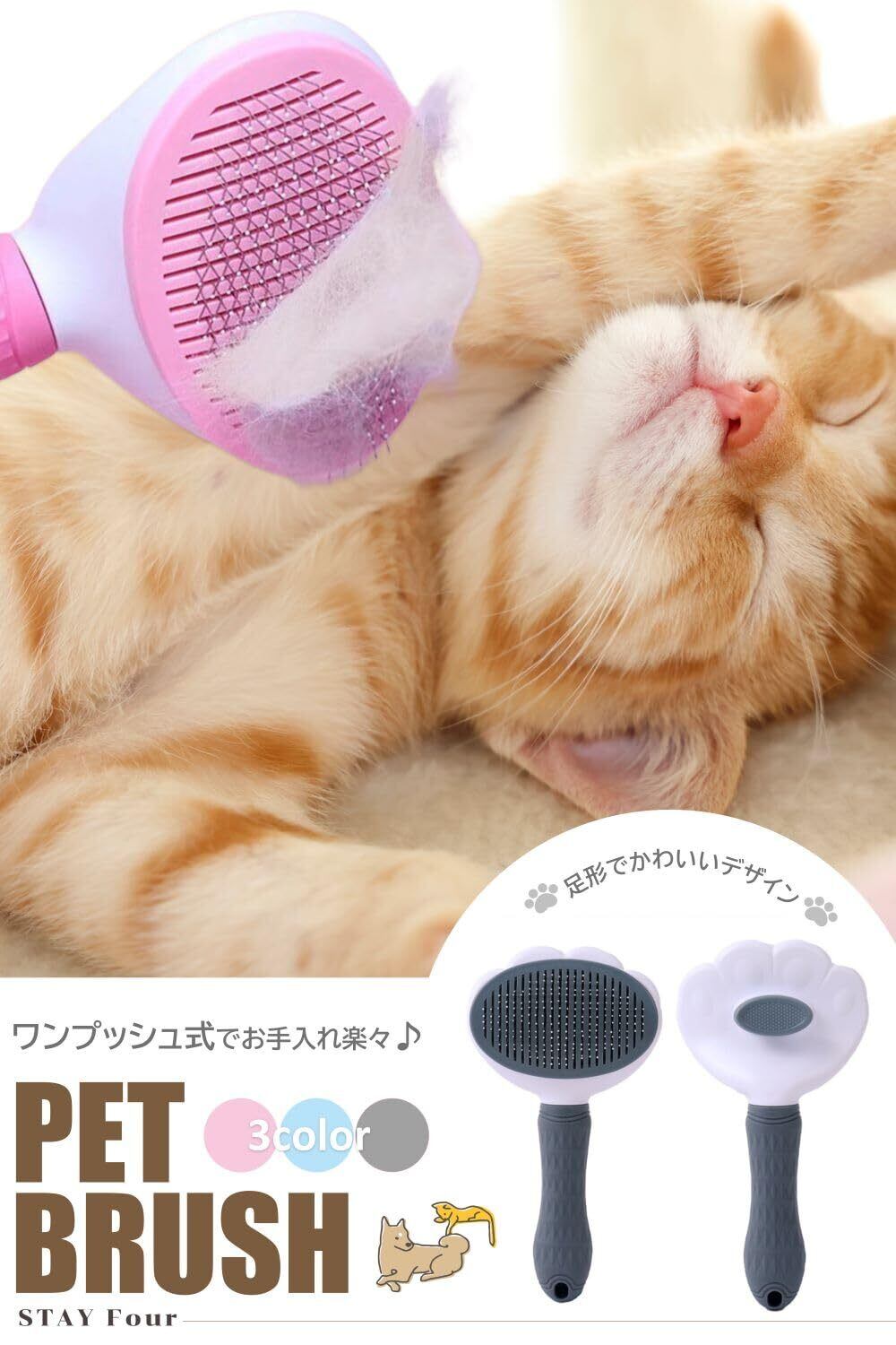STAY Four ペット用ブラシ 犬猫兼用 スリッカーブラシ 抜け毛取り ボタンを押し簡単抜け毛除去 ワンプッシュ式 痛くない マッサージ 丸洗い可能 短毛 中毛 長毛 (ピンク)