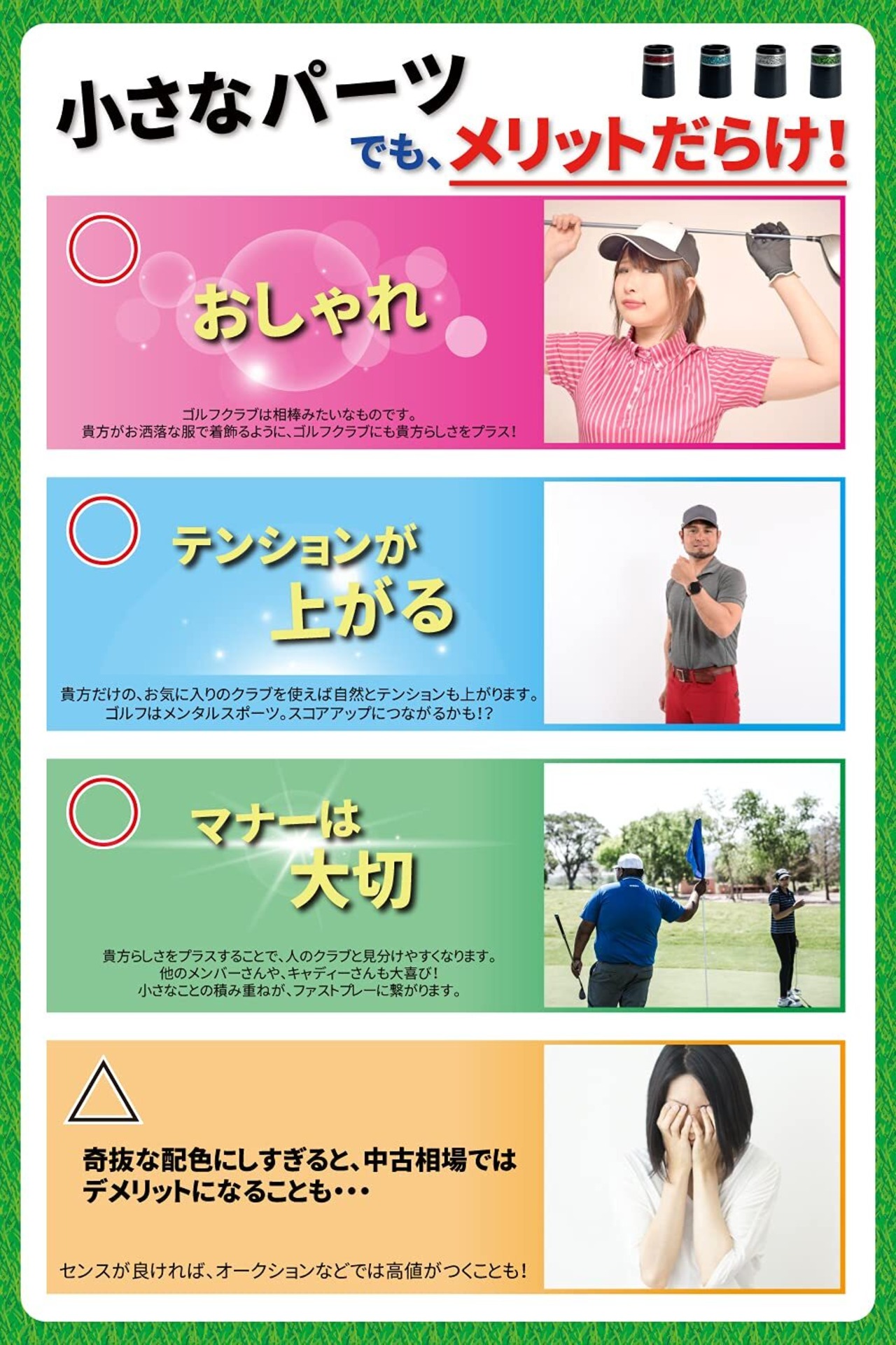 【メリット】 小さなパーツですがメリットだらけです。お洒落なゴルフクラブにカスタム。オリジナリティーをプラスすることでテンションが上がってスコアアップにつながるかも!?他メンバーさんのクラブと見分けやすくなり、ファストプレーに繋がります。