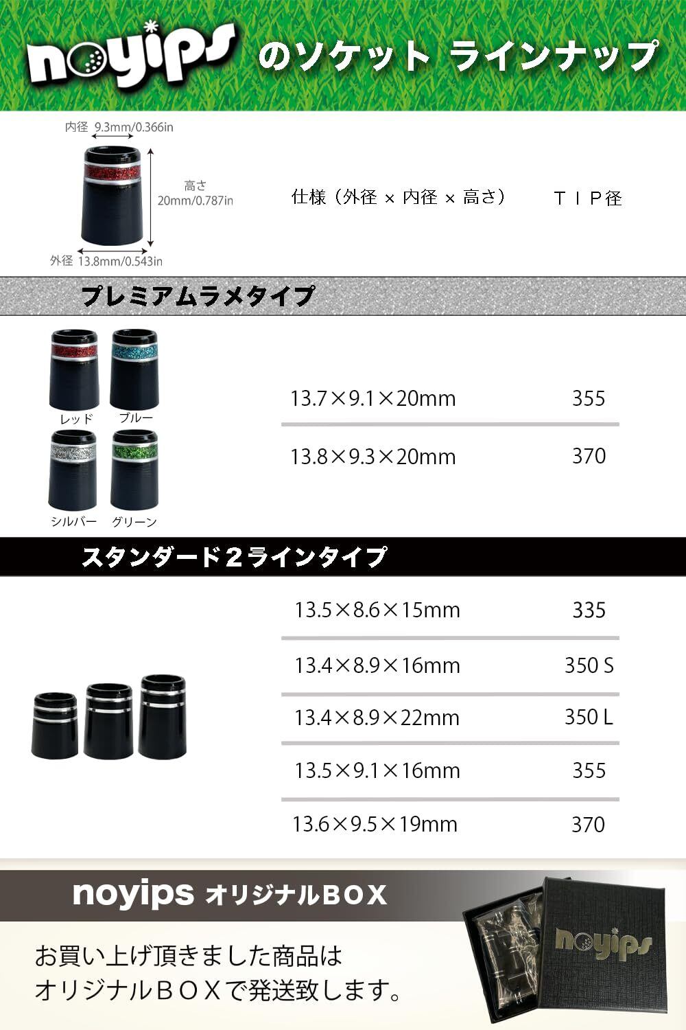 【チップ径】 スチールシャフト、カーボンシャフト、テーパーorパラレルなど、圧入する場合は使用するシャフトが公表しているスペックをご参考ください。デザインを優先する場合は大きいものを接着剤で仕上げてもOKです。335、350、355、370をご用意しております、ご購入前にデザインとサイズを画像のラインナップより今一度ご確認お願いします。