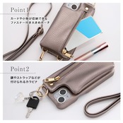 カードやリップなどが入る便利なポーチ付き!。ポーチはスタンドとしても使用可能。ショルダーストラップは長さ調整が可能。