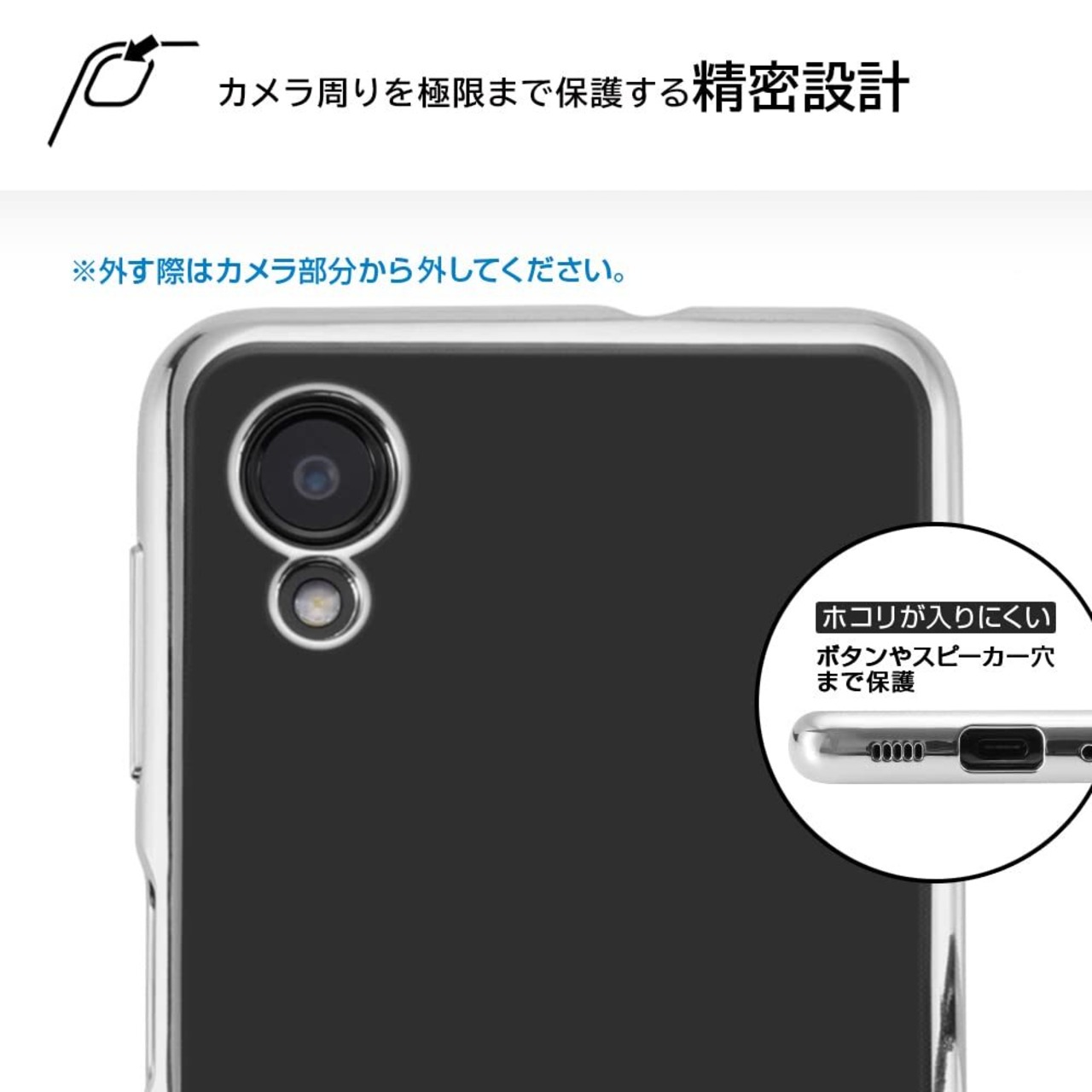 ソフト素材で耐衝撃。カメラ周りを極限まで保護し、レンズに傷が付きにくい設計。ボタンやスピーカー穴まで保護しホコリが入りにくい。密着痕が出にくいマイクロドット加工。