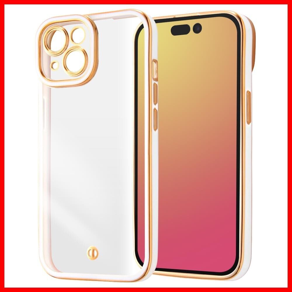 iPhone15 ケース クリア メタル フレーム カメラ保護 耐衝撃 メッキ加工 ストラップホール 付き アイフォン 15 カバー/ホワイト/ゴールド