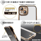 カメラやスピーカー周りまで精密に設計、背面・側面をしっかり保護 / アクセントにメッキ加工が施され高級感を演出 / 衝撃に強いTPU素材を採用、しなやかでケースの着脱もかんたん / 背面に虹色の干渉痕を抑えるマイクロドット加工を施工
