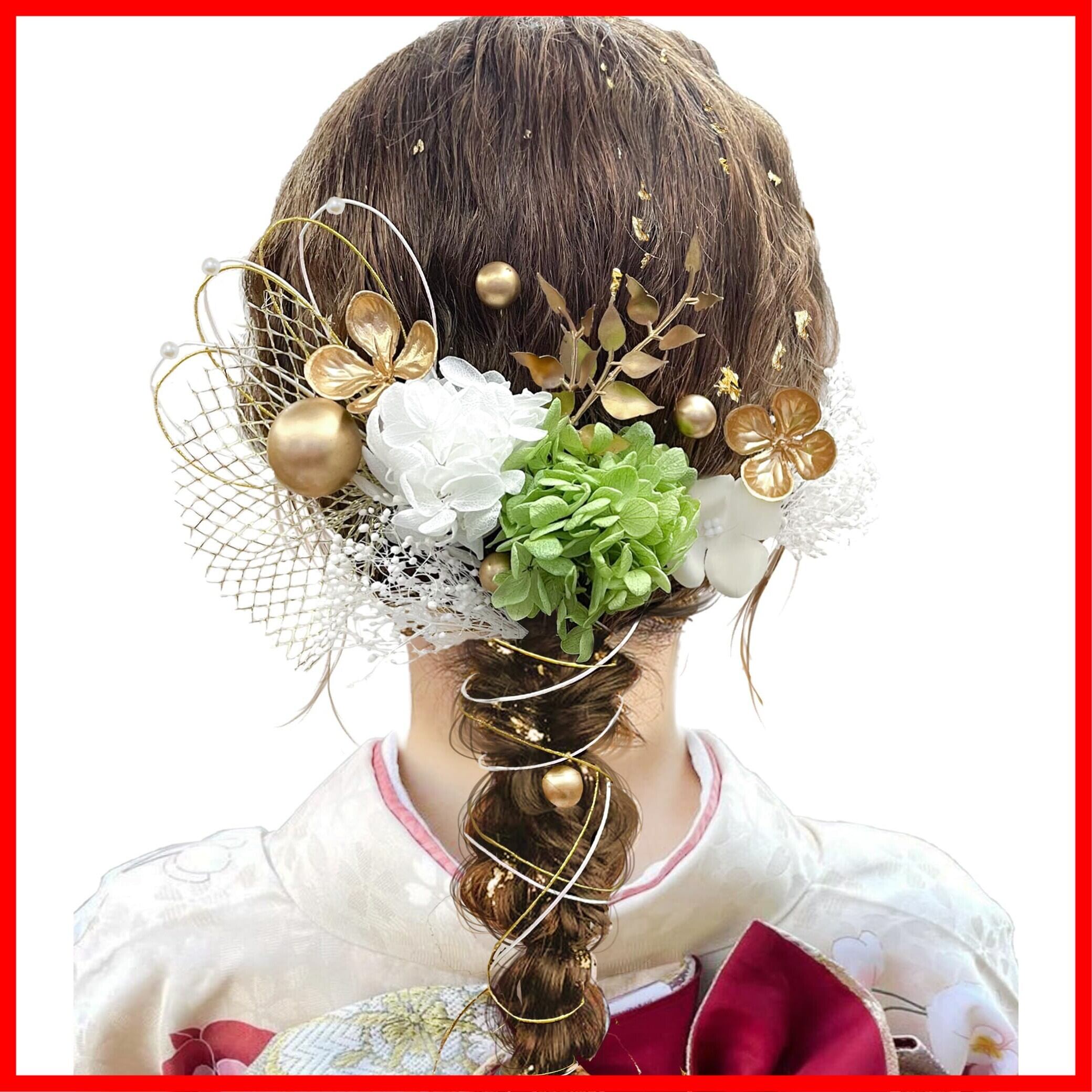 髪飾り 【9色展開】 成人式 卒業式 振袖 和装 着物 袴 浴衣に 七五三 ドライフラワー 金箔 和玉 組紐 水引き かすみ草 網型飾り 専用ケース付き A1101