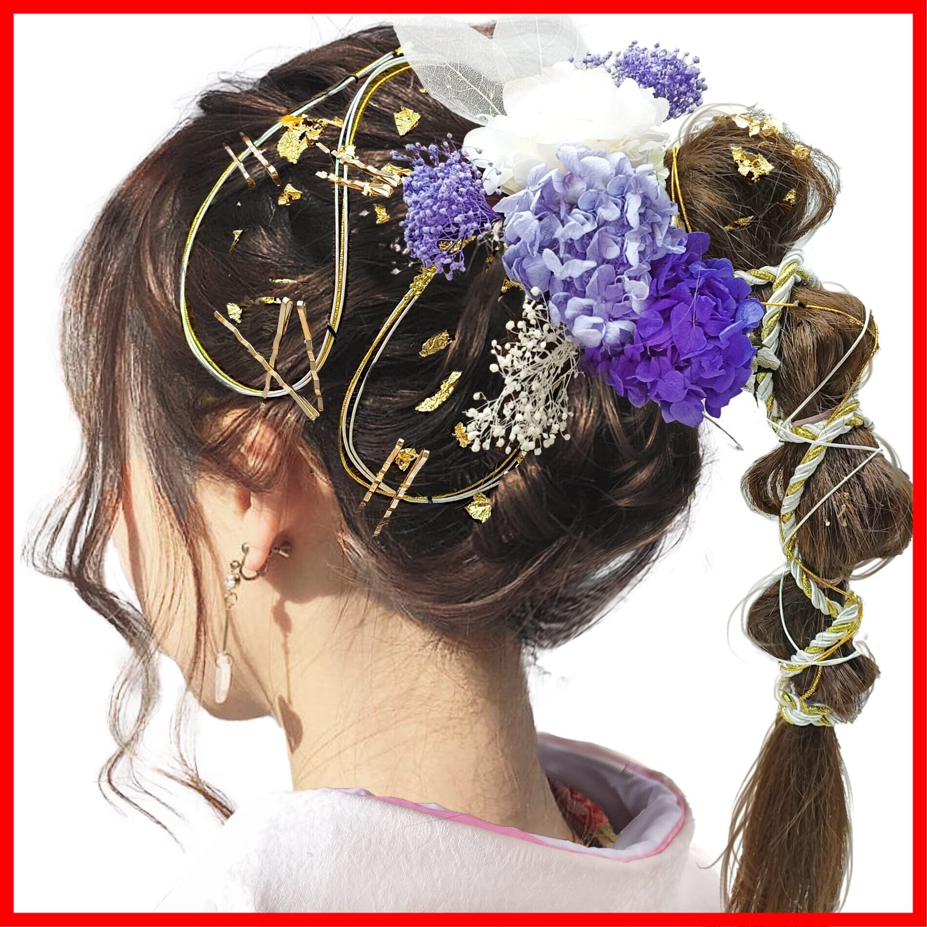 【多様性】 水引とゴールドピンが入れ、画像のポニーテール写真のように使用でき、他のドラ イフラワーをセットして利用も可能で、お好きなスタイルに従って、カスタマイズいただけま す