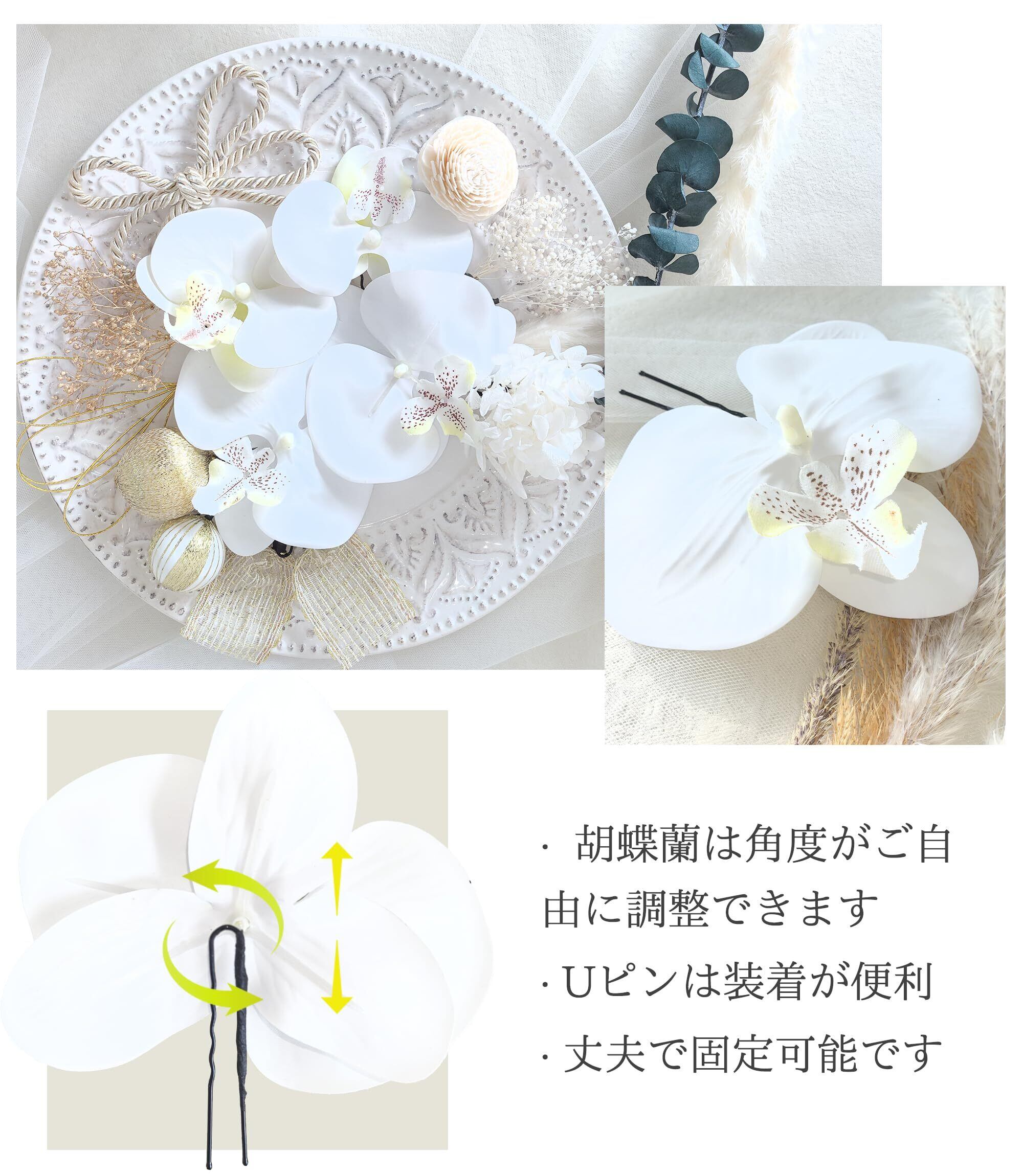 【純白胡蝶蘭】大輪の純白胡蝶蘭はまるで本物のような美しい質感で、上品でエレガントなイメージを作ってくれます。かなり大きめなサイズが周りの目を引き、小顔効果も期待できます。ほかのお花やかすみ草、和風の和玉、組紐、水引きなどと相まって、ヘアメイクに華を添えてくれます。