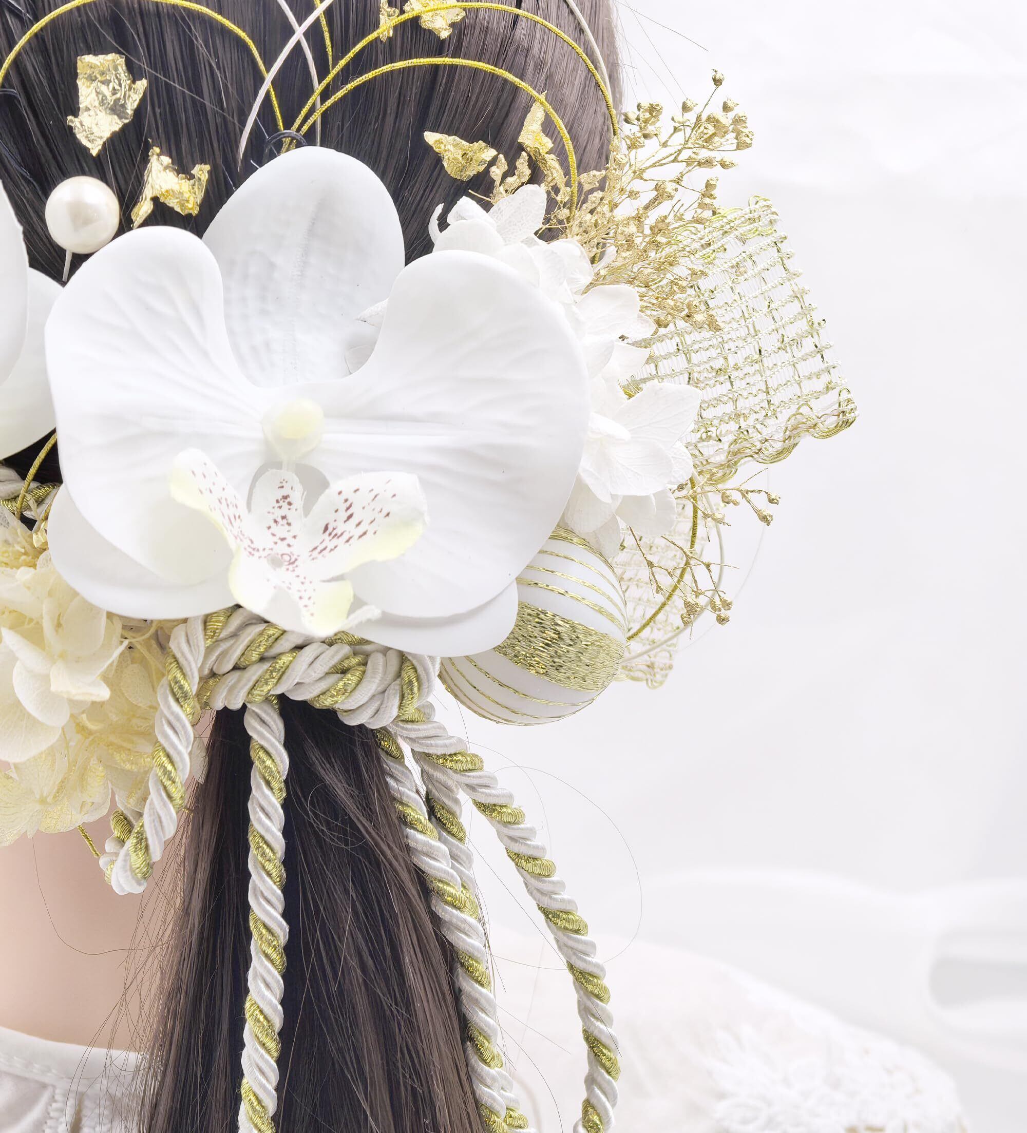 【商品のご説明】ご覧いただきありがとうございます。本品は白い胡蝶蘭がメインに和玉、網型飾り、水引きなど様々なゴールド系のパーツが組み合わさったオリジナル髪飾りです。パーツの数が異なるそれぞれ3タイプをご用意しており、どれもキレイで上品さが溢れます。