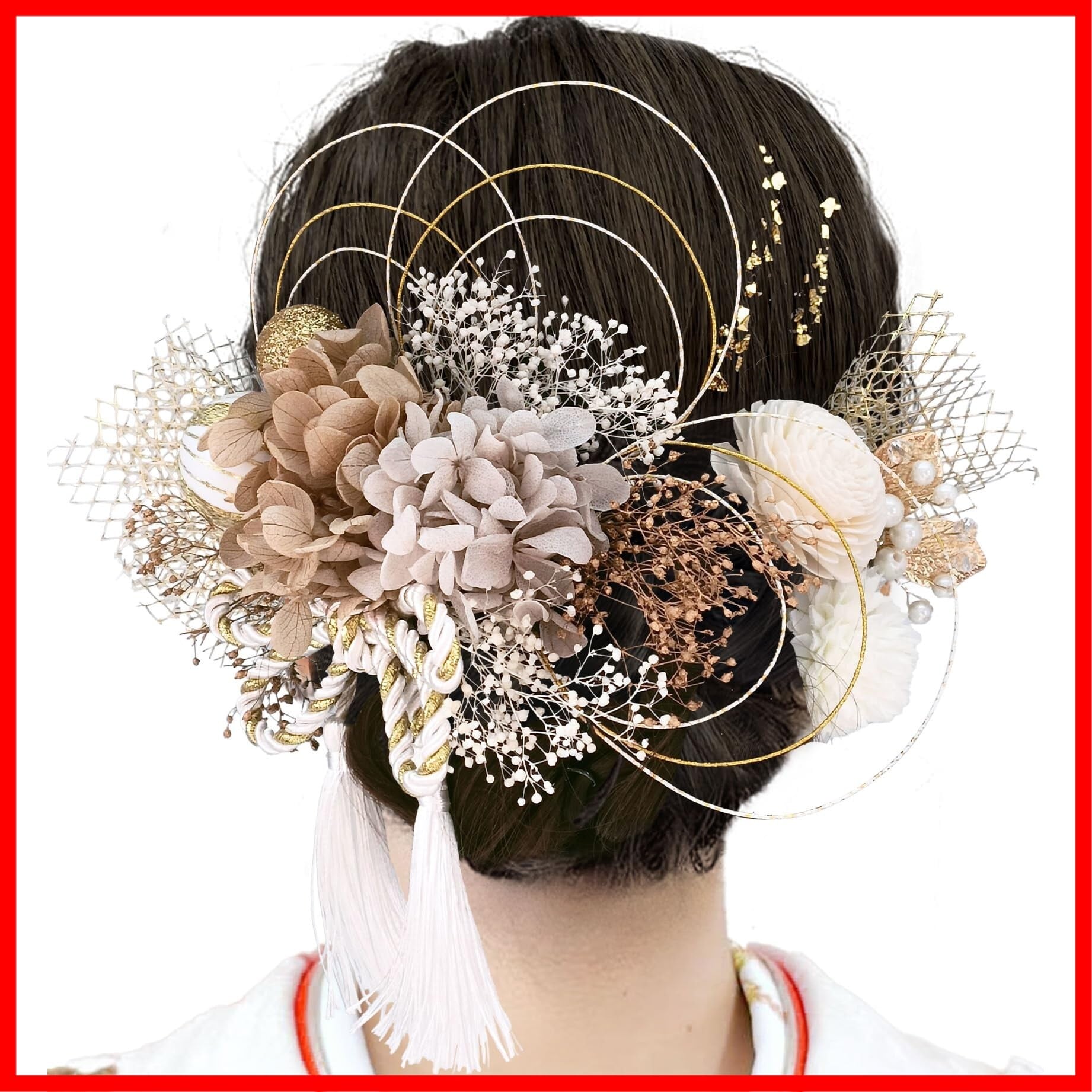 【選び抜かれた素材】髪飾りの素材は高品質なドライフラワーと装飾を使用しており、耐久性と美しさを兼ね備えています。金の装飾は高尚で華やかな印象を与え、全体に贅沢感を加えます。白のドライフラワーは軽やかさと柔らかさを加え、華やかさの中に優雅さを失わず、上品さを保ちます。花弁の紋理から金属装飾の輝きまで、職人の秀逸な技量が感じられます。