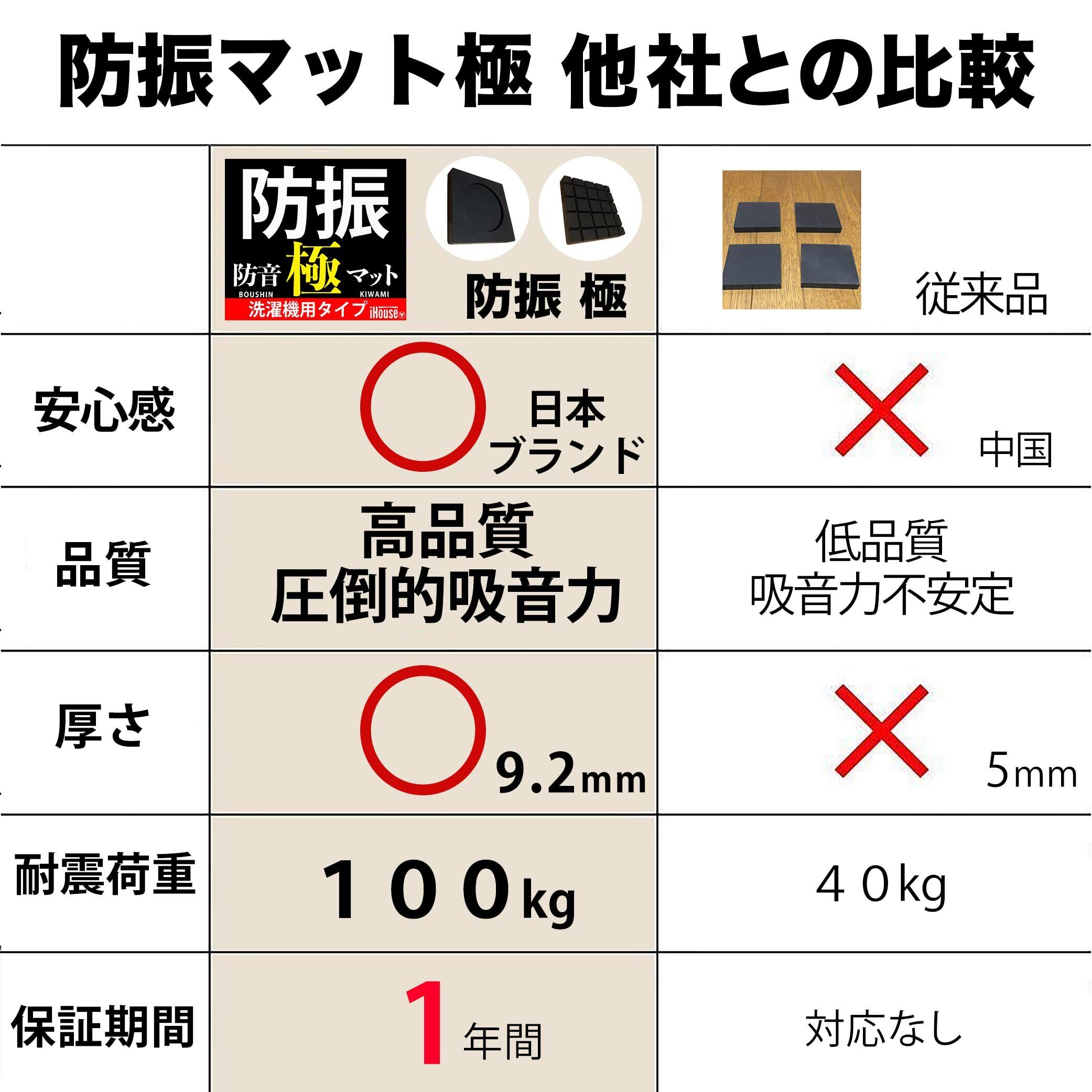 【防振力No1】洗濯機による振動をしっかり防音。4枚以上の設置で耐荷重100kgでトップクラスの防音力を持つことが可能です。防音力に重視をして安価なゴム素材を使わずに高品質で厚さ9.2mm の極厚防音ゴムで振動をカットします。
