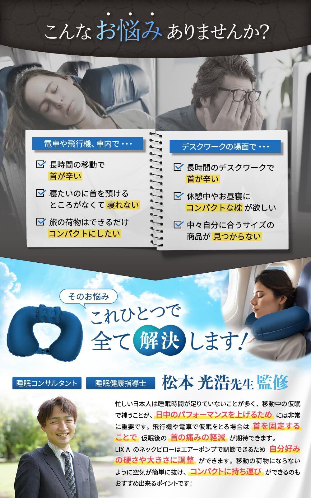 【じゃらん掲載】LIXIA ネックピロー コンパクト ポンプ式 軽量 【ヘッドレスト付き】 飛行機 首枕 旅行用 エアー (電車/飛行機/車などに)(ブラック)
