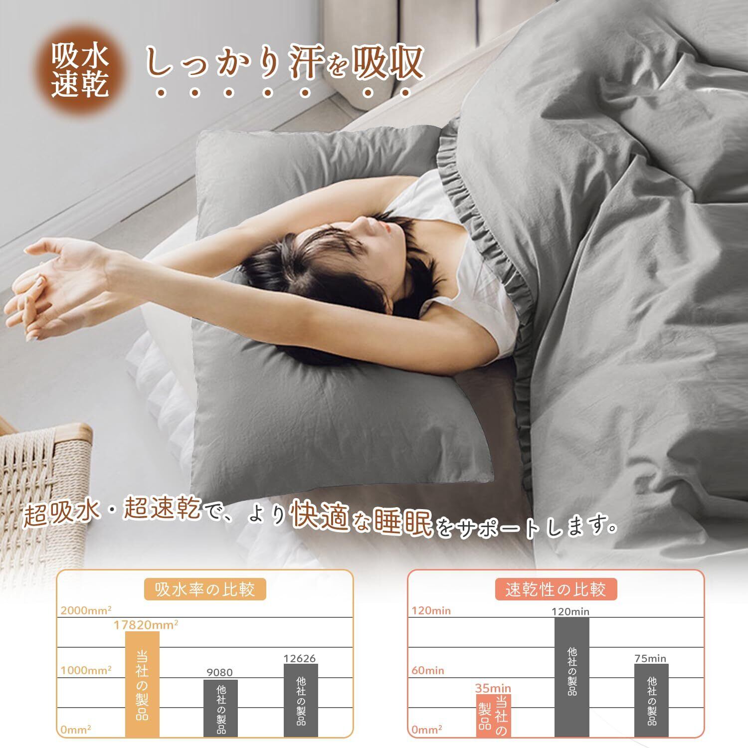 【通気性抜群&蒸れにくい快適設計】枕カバーは直接肌に触れるものだから、通気性の良さが重要。吸湿速乾性に優れた生地を採用し、汗や湿気を素早く吸収・発散。寝汗をかきやすい季節でもさらっと快適に過ごせます。オールシーズン対応で、一年中気持ちの良い寝心地を提供します。