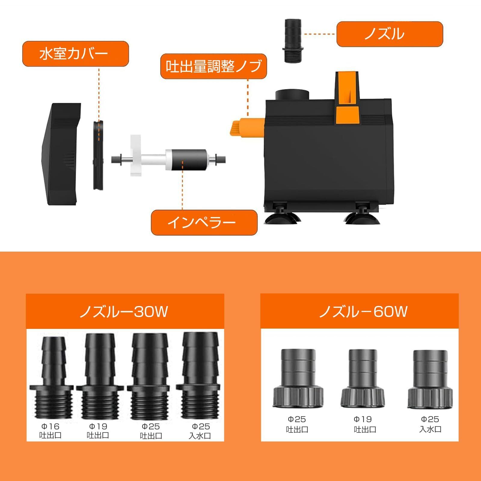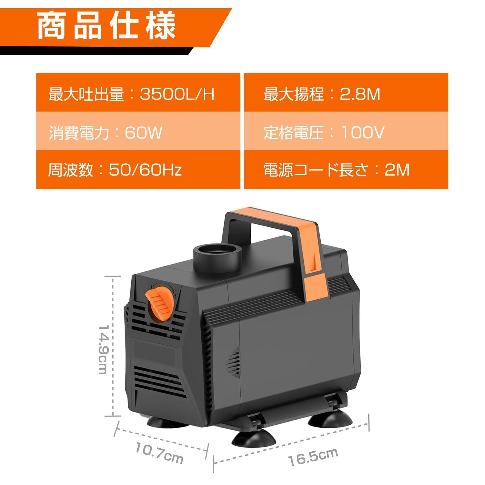 水中ポンプ 水陸両用式 THYESCOM 給水・排水ポンプ 水槽ポンプ 流量調整可能 最大吐出量3500L/H 最大揚程2.8M 循環ポンプ 静音設計 ウォーターポンプ 3つノズル付き 水耕栽培/水族館水換え/池/風呂水/ガーデン 2M電源コード 60W | hananoki