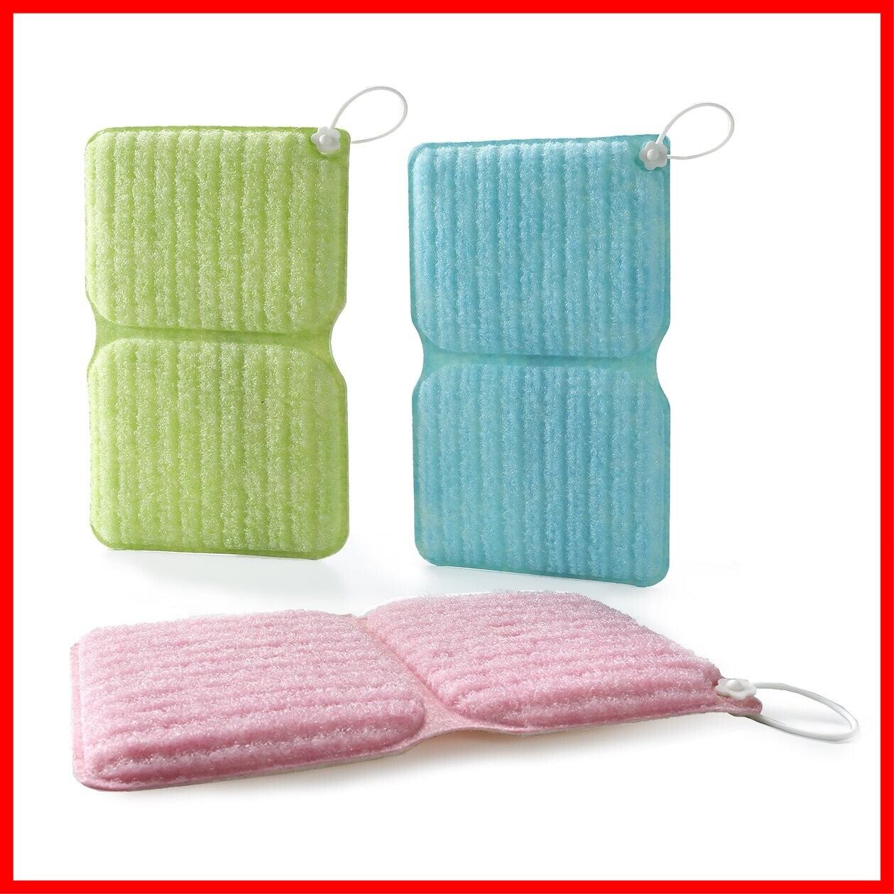 中央に折り目が付いているので、ホースや桶などの挟み洗い、伸ばしたまま、折り曲げて厚みのあるスポンジにするなど、いろんな使い方ができます。