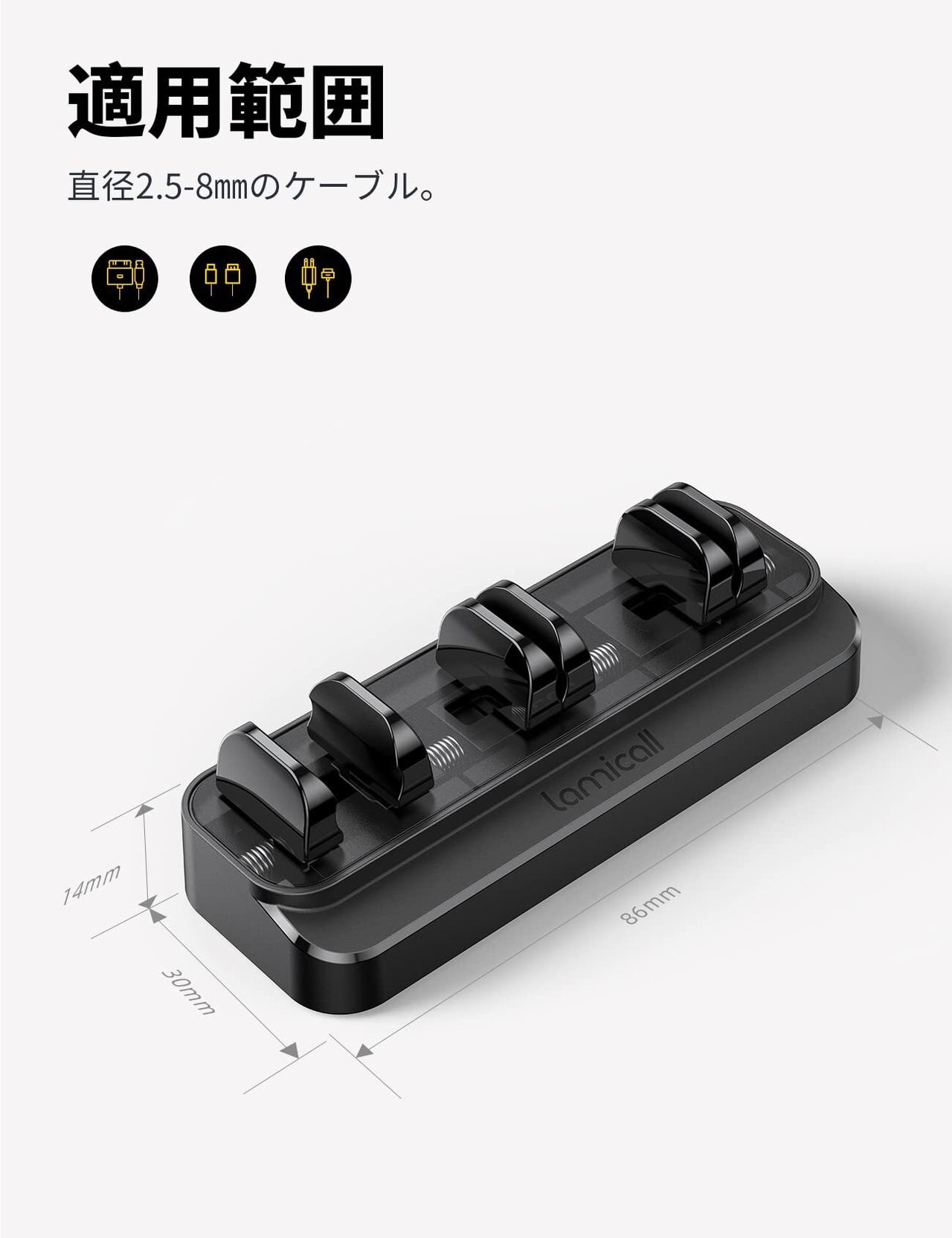 【バネ内蔵】従来のマグネット式ケーブルクリップと異なり、スプリングクリップの構造で、適用範囲はもっと広いです。直径2.5-8㎜のケーブルに対応可能です。それに、片手でポンとケーブルを固定でき、暗い所でケーブルを戻そうとするといちいち見て確認しなくても戻せます。ケーブルがスルッと落ちて、何度も拾って困るということも有りません。