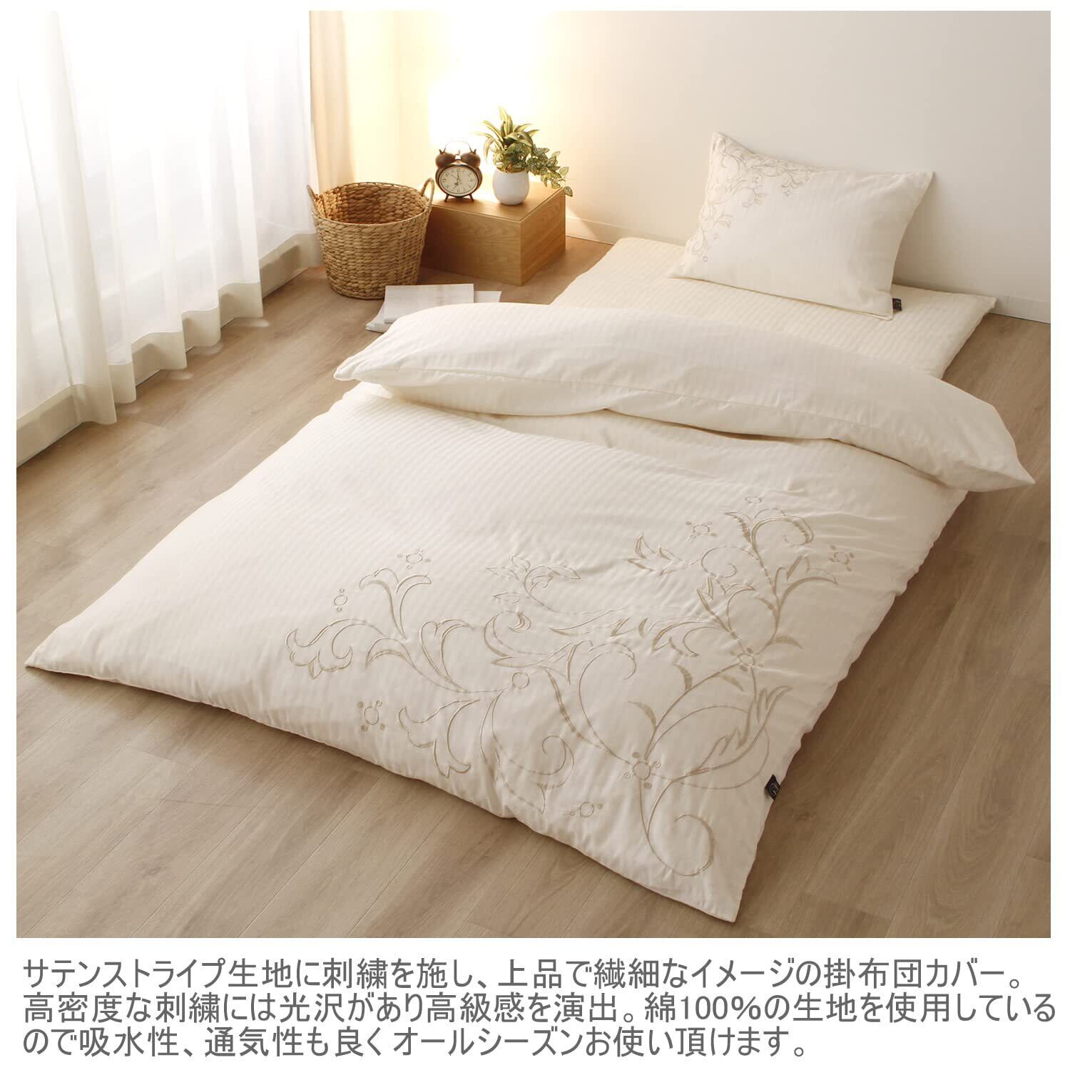 サテンストライプに刺繍を施し、上品で繊細なイメージの掛布団カバー。高密度な刺繍には光沢があり高級感を演出。サテンストライプの特長でもある上品な光沢感と滑らかな肌触りがラグジュアリー感のあるベッドルームを演出。綿100%の生地を使用し保湿性、吸水性に優れている為 オールシーズン快適にお使いいただけます。