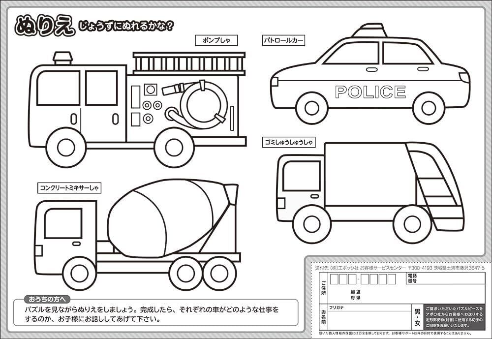 パトカーや消防車など、27種類の自動車が掲載されたパズルです。