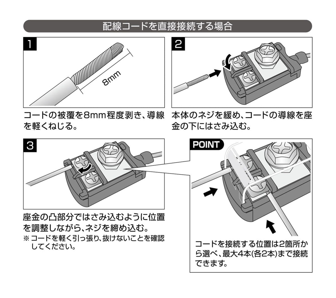 最大8本接続可能(クワ型端子6φ/4本・配線コード0.2~0.75sq/4本)