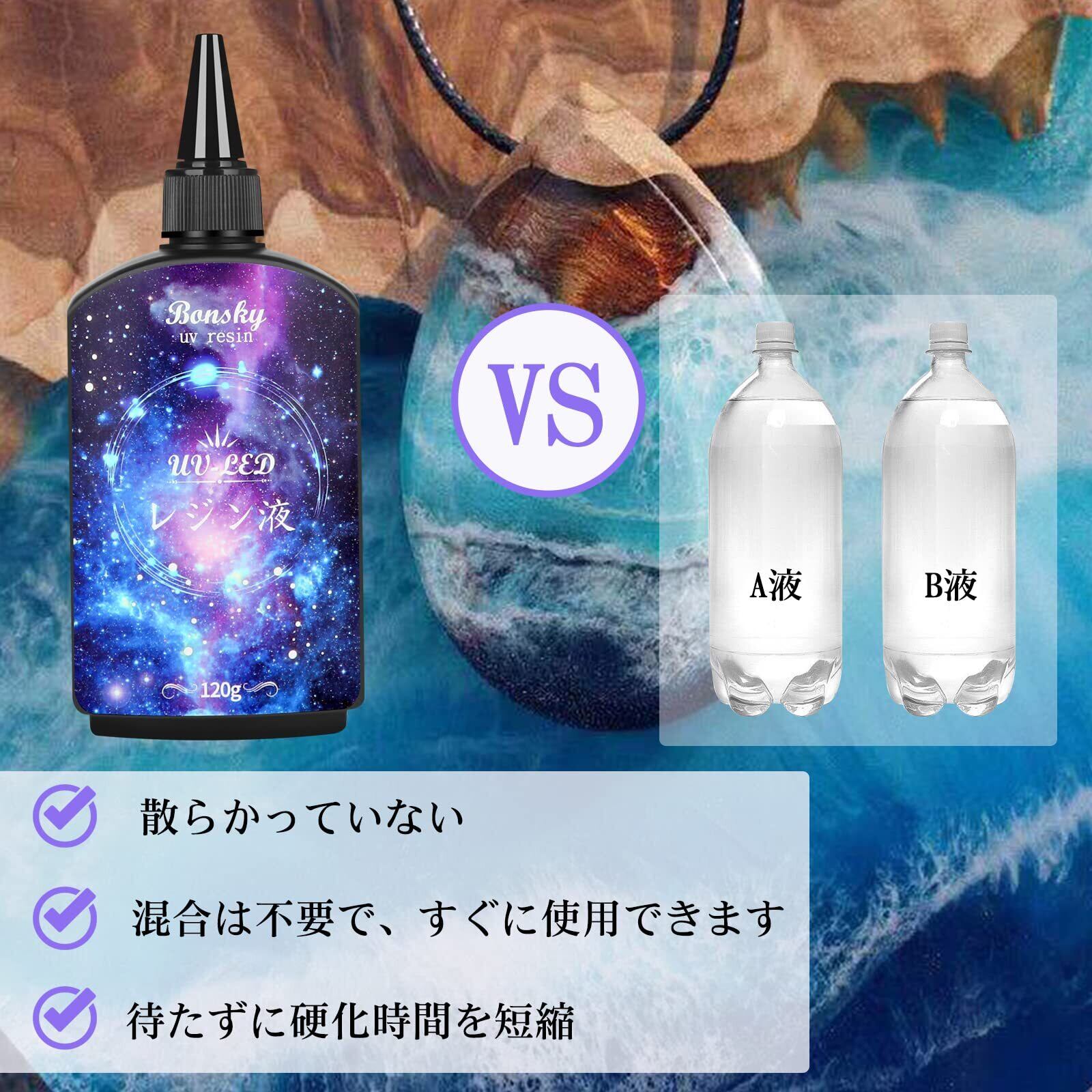 パッケージ内容:Bonsky UVレジン液 120g*2、尖ったボトルキャップ*2、アルミフィルム封止 オープナー*1、硅胶混合工具套装*1、取扱説明書。ご質問がございましたら、お問い合わせください。