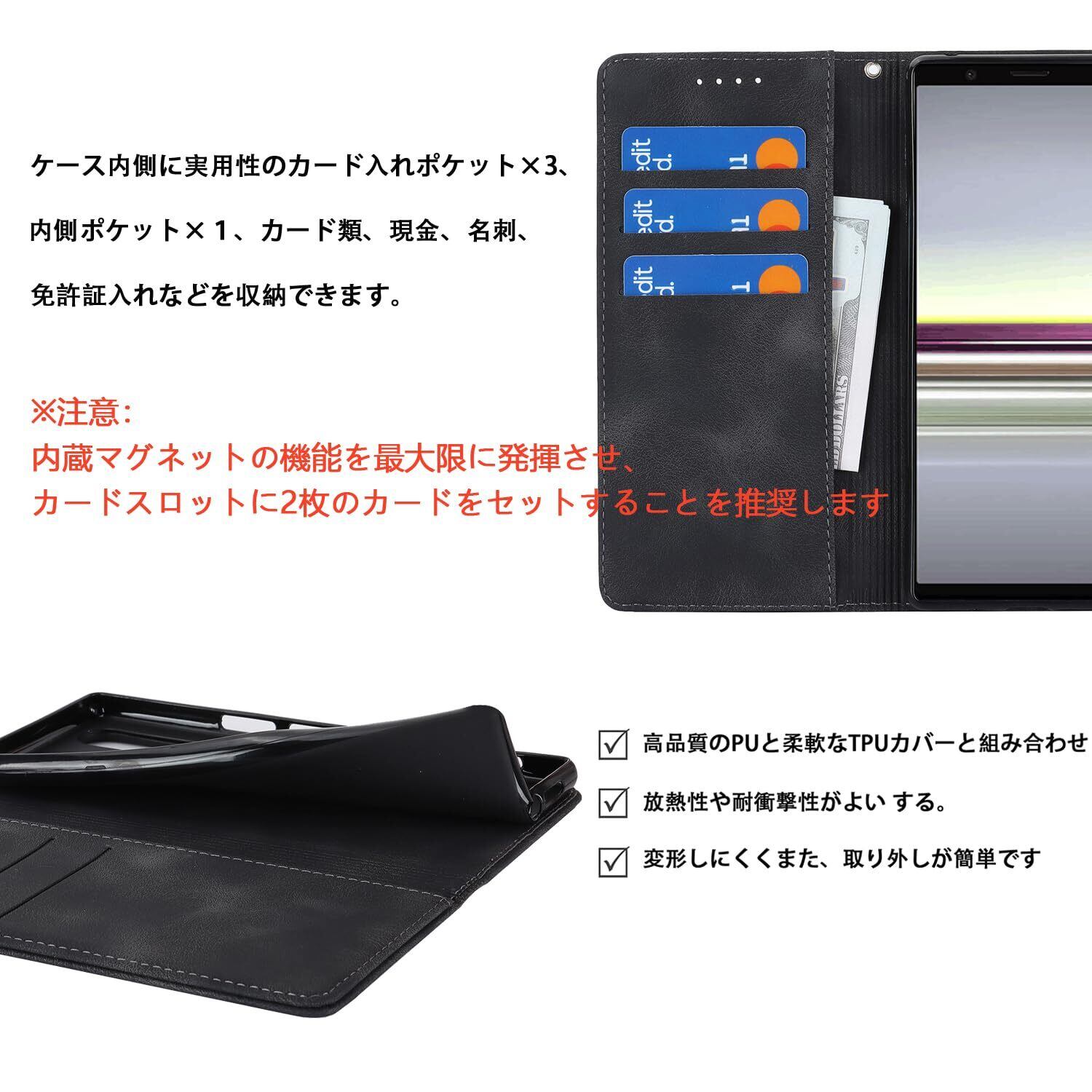 【収納機能】Xperia XZ5/5(SOV41/SO-01M/901SO)/2ケース内側に実用性のカード入れポケット×3、内側ポケット×1、カード類、現金、名刺、免許証入れなどを収納でき、通勤も通学にも楽々タイプです。内蔵マグネットの機能を最大限に発揮させ、カードの消磁を防ぐために、カードスロットに2枚のカードをセットすることを推奨します。