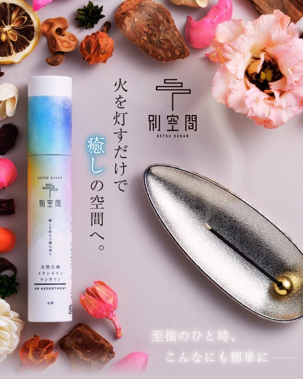 ️【別空間 お香3種類 お香たて付き】お香3種類とお香たてを一緒に。天然白檀、イランイラン、マンダリンオレンジが各種入って、毎日違う香りを楽しめます。