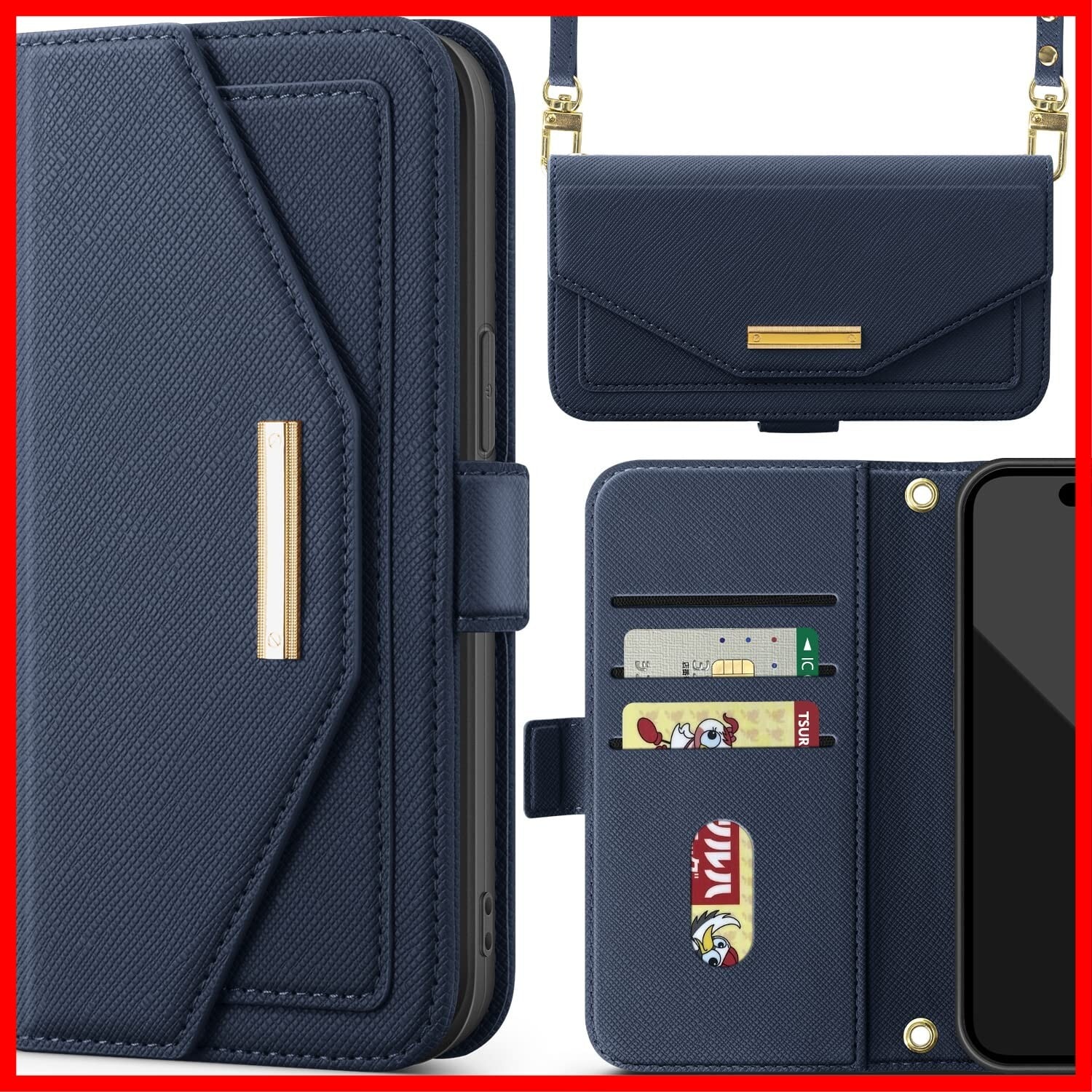 NODALA iPhone 15 ケース 手帳型 アイフォン15 スマホケース 財布型 ショルダー あいふぉん15 携帯ケース 肩掛け 斜めがけ カバー 手帳型 小銭入れ カード収納 ロングストラップ 長さ調節可能 ミラー付き女性 おしゃれ 横置 ステント機能 折りたたみ 耐衝撃 PUレザー ブルー