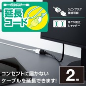 機器のコードがコンセントに届かない場合などに、電源を延長するためのコードです。極性のある2ピン式プラグ・3ピン式プラグでも使用できます。直径10mmの吊り穴を配したシリコン製のタグが付属しており、フックなどに引っ掛けることが可能。トラッキング防止プラグやホコリ防止シャッターで使用時の事故を防ぎ心配なく使えます。 ※3ピン式プラグ使用時、アースは機能しません。