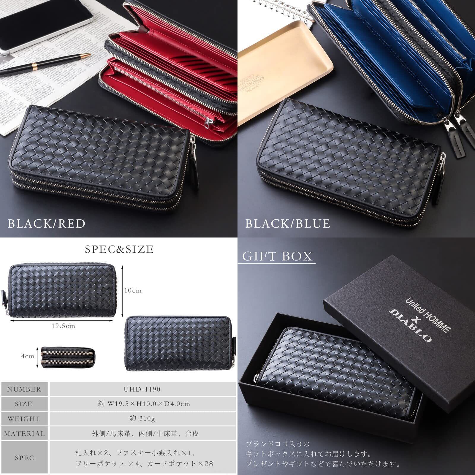 [ディアブロ] 財布 メンズ 長財布 メッシュ 革 大容量 ダブルファスナー ラウンドファスナー United HOMMEコラボアイテム 【UHD-1190】 (ブラック×ブルー) | hananoki