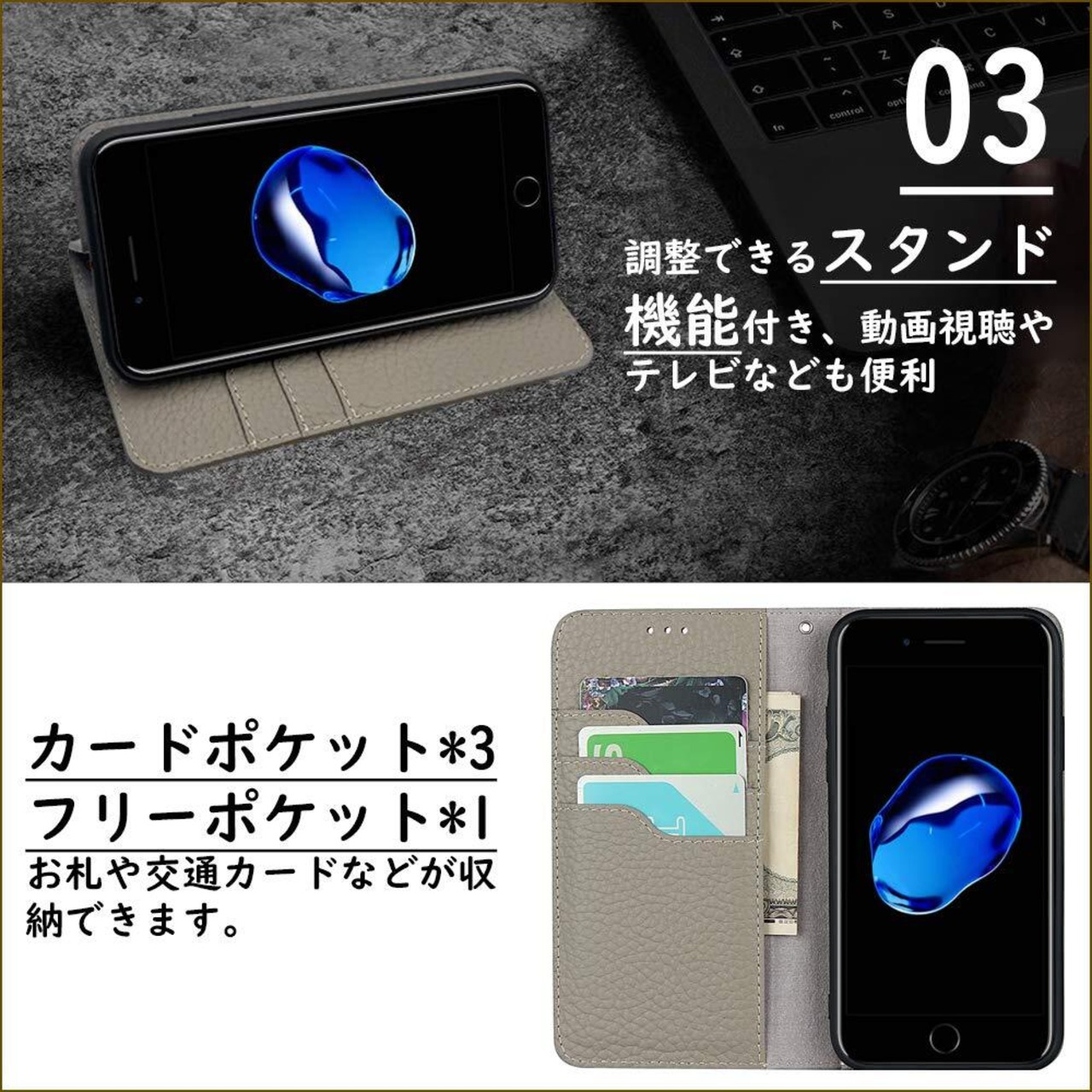 CLICSUN iPhone SE 第2世代 iPhone7 iPhone8 対応ケース 高級牛本革 iPhone se3 対応ケース 手帳型 アイフォンSE 2020 アイフォン7/8 対応カバー 本革 レザー カバー スタンド機能 ストラップ付き マグネット式 カードポケット ギフトボックス付き グレー | hananoki