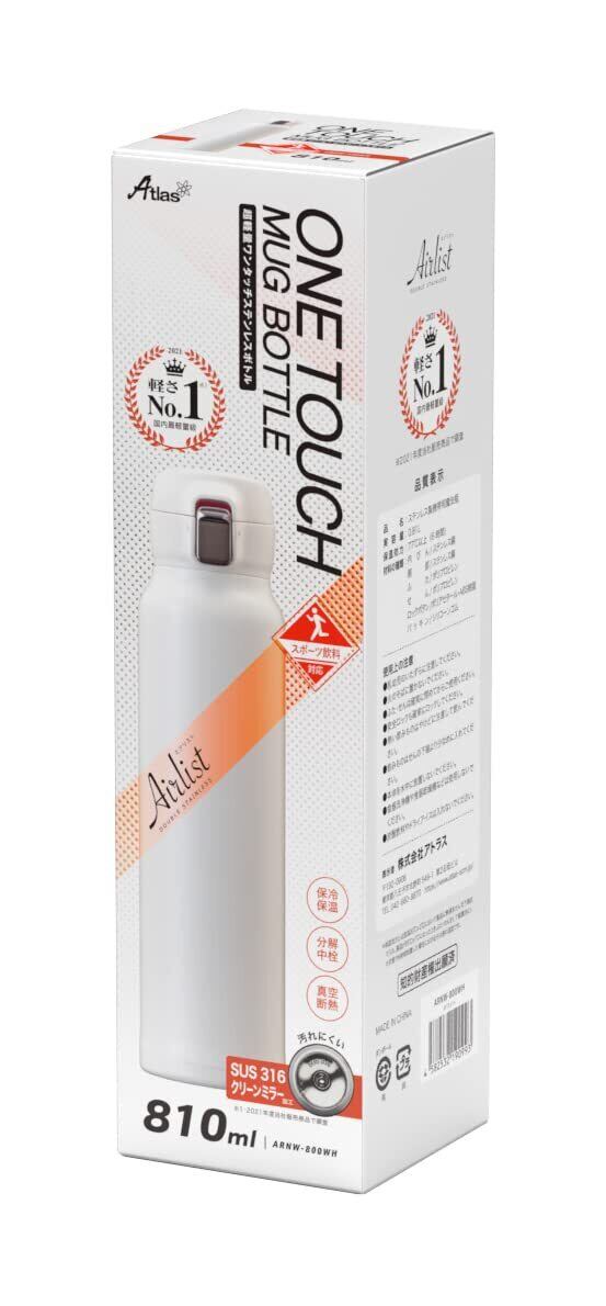 アトラス 水筒 810ml 保温 保冷 真空断熱 ステンレス 軽量 ワンタッチボトル エアリスト ホワイト 白湯 ARNW-800WH