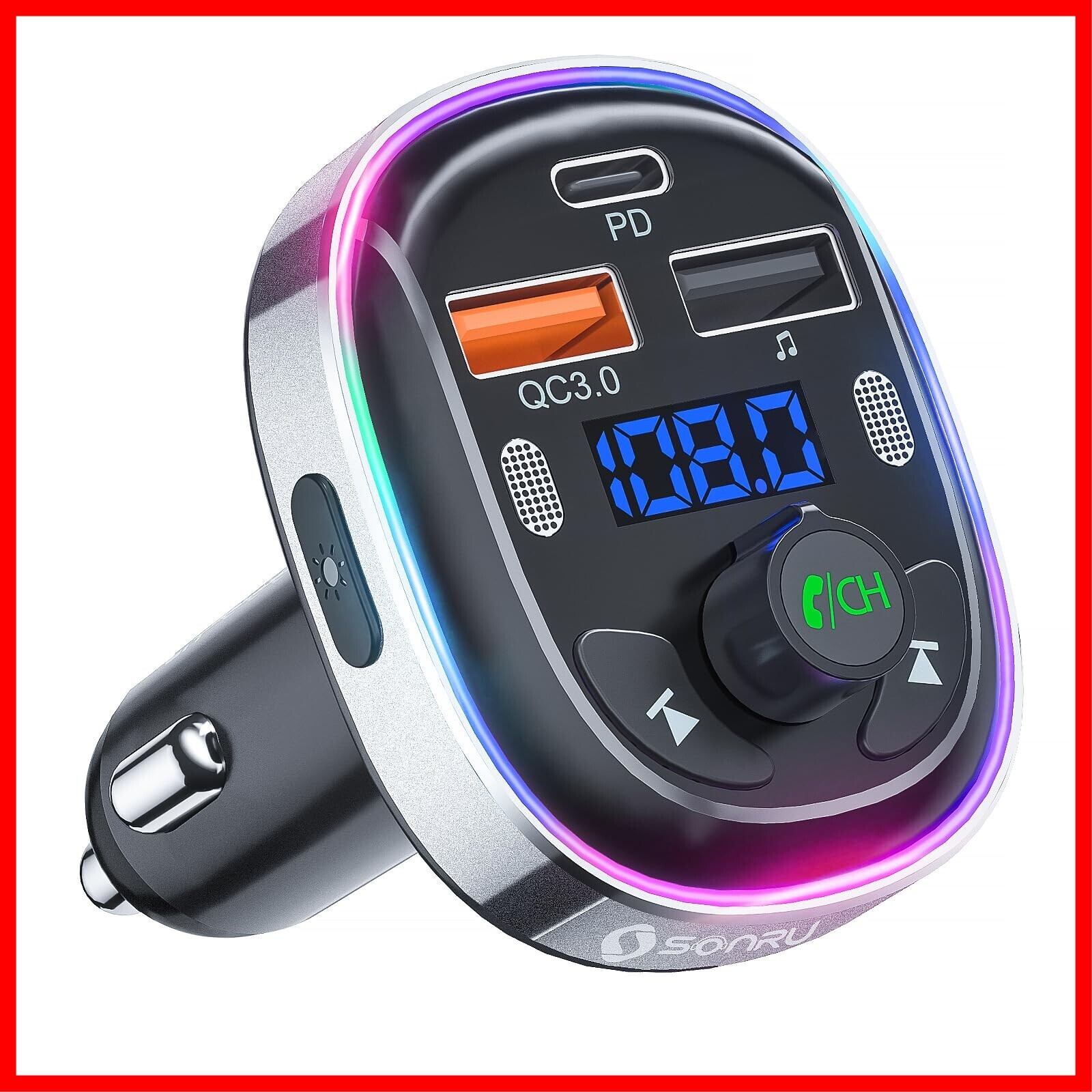 【 2025進化モデル】SONRU FMトランスミッター Bluetooth 5.3 デュアルマイク ノイズ軽減 車載充電器 3つポート USB&Type-C QC3.0急速充電 PD30W対応 車載FMトランスミッター 12V/24V車対応 ハンズフリー通話 7色LEDライト シガーソケット USBメモリSiri&Google Assistant対応 日本語取扱説明書