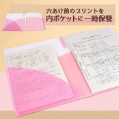 シリーズ初の内ポケットは穴あけ前のプリントの保管に、おなじみの外ポケットは付箋やメモの持ち運びにおすすめです。