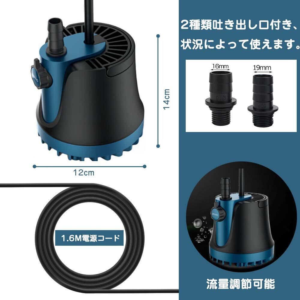 【規格】入力電圧:AC 100V/60Hz 電力:35W 最大揚程:2.5Mぐらい 吐き出し口外径:16mm&19mm 最大流量:2500L/H 騒音クラス:40デシベル以下 電源コードの長さ:1.9M