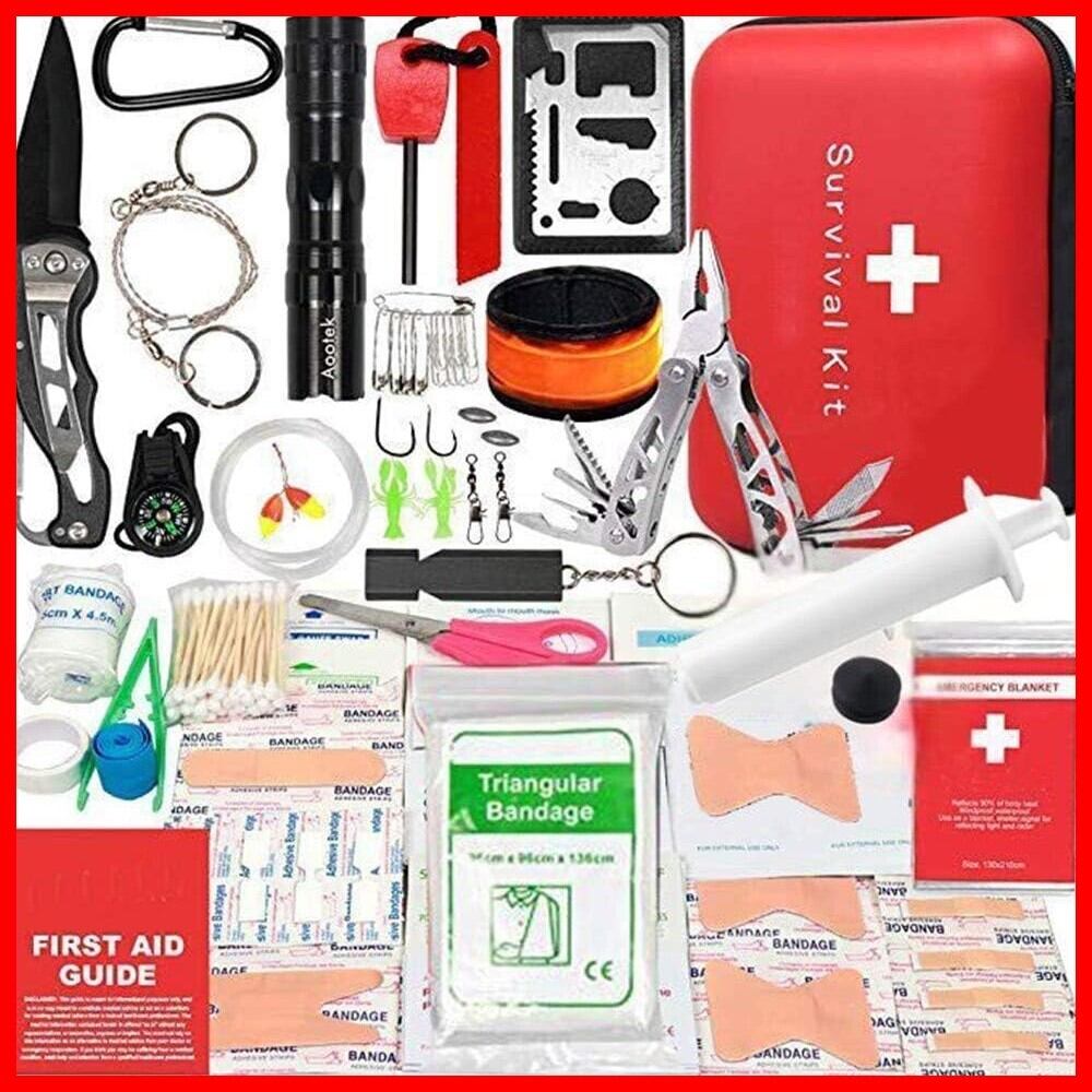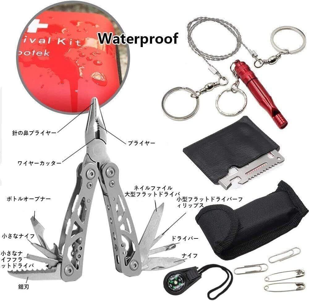 40種救急ツール:火打ち石、線鋸、呼子笛、生存カード、 多機能ナイフ、エクストラクター ポイズンリムーバー、カラビナ、コンパス、サバイバルシート、防水バッグ、ナイフ、明るいLED懐中電灯、コットンスティック、釣り糸、釣りおもり、釣りフック、はさみ、フロート、包帯三角法、LED リストストラップ、プラスチックピンセット、応急処置ガイド、バンドエイド セットする など。