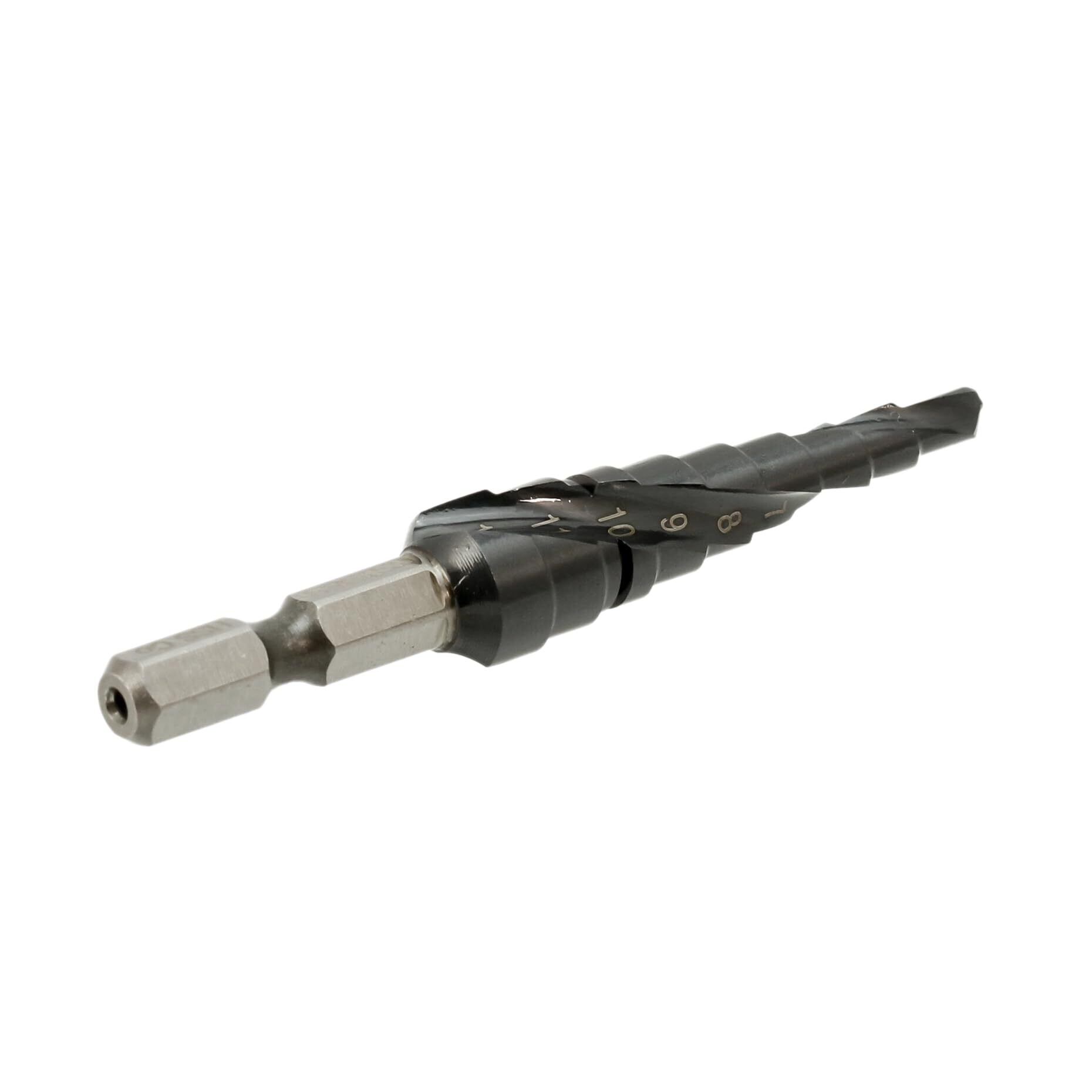 ステップドリル たけのこドリル タケノコドリル ステンレス用 ドリル チタンコーティング 段付きドリル テーパシャンクドリル (4-12mm 9段) 【先端のクロスシンニング加工でズレを防ぎ、正確に穴あけ】特別な加工技術で作られた先端は、素早くかつ精密に穴あけ作業ができます。切断抵抗も低減され、工具やバッテリーの寿命も延ばします。 【スパイラル溝が切りくずを効率的に排出】スパイラル溝のおかげで切削時に発生する切りくずをすばやく排出し、加工抵抗を低く保ちます。高精度な穴あけと摩耗の少なさを実現します。 【コバルトハイス鋼で作られた耐久性の高いドリル】コバルトを含む鋼材は、耐熱性や防錆性が高く、高速加工にも強いドリルです。ステンレスをはじめとするさまざまな材質に対応します 【1本で多種多様な穴あけが可能】穴あけ直径は4-12mm仕様は1mm刻みとなっており、ビットを交換することなく、さまざまなサイズの穴あけができます。工具箱に入れておくと便利な1本です。 【インパクトドリルにも対応】一般的な6.35mm六角軸を採用しているので、インパクトドリルやインパクトドライバーで使えます。もちろん、キーレスチャックやキー付チャック式でも使えます。 【高い汎用性と高精度加工のバランス】鉄鋼・アルミは2mm、ステンレスは1mmが加工目安厚さです。樹脂や木材などでは5mm厚まで対応します。2枚刃の高精度仕上げで、穴あけ断面も美しく仕上がります。