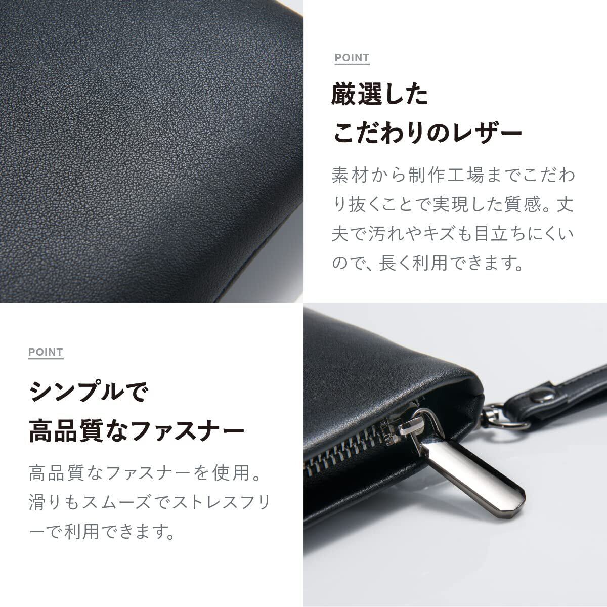 【厳選した素材】バッグのレザーからファスナーまでこだわり抜いて実現した質感。レザーは風合いが上品なPUレザーを使用。丈夫で汚れやキズも目立ちにくいので長く利用できます。