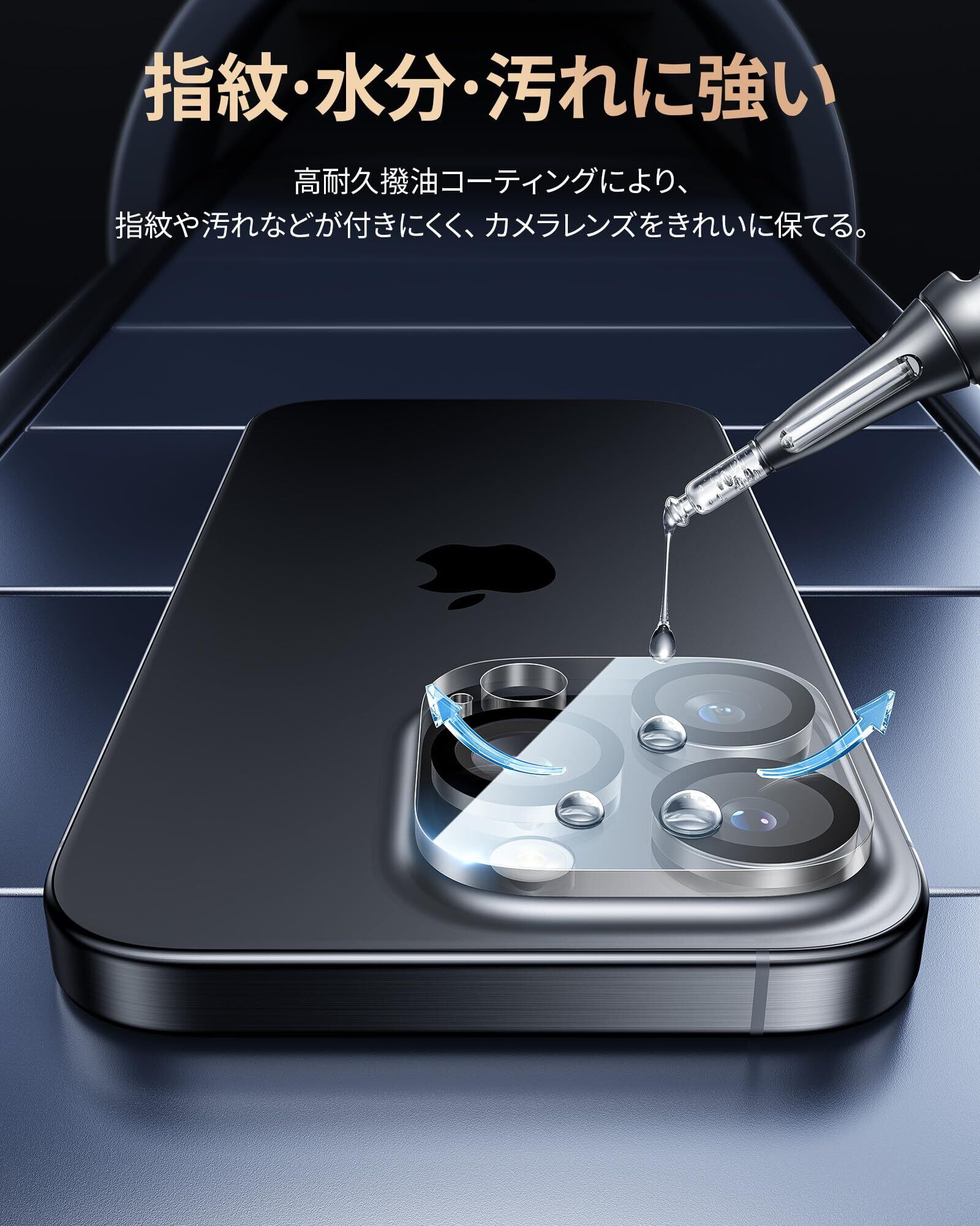 「9H硬度·傷付きにくい」9H硬度ガラスを採用し、ハードコーティング技術により外部からの衝撃をフィルムが吸収し、衝撃を緩和し画面の破損を最小限に抑えます。日常生活の中で、バッグやポケットの中で付いてしまう引っかき傷に対しても高い耐久性を持っているので、いPhone16Pro/いPhone16ProMaxのカメラをしっかりと守ります。また、特殊な飛散防止加工により、万が一割れてもガラス破片が飛び散ることなく安心です。