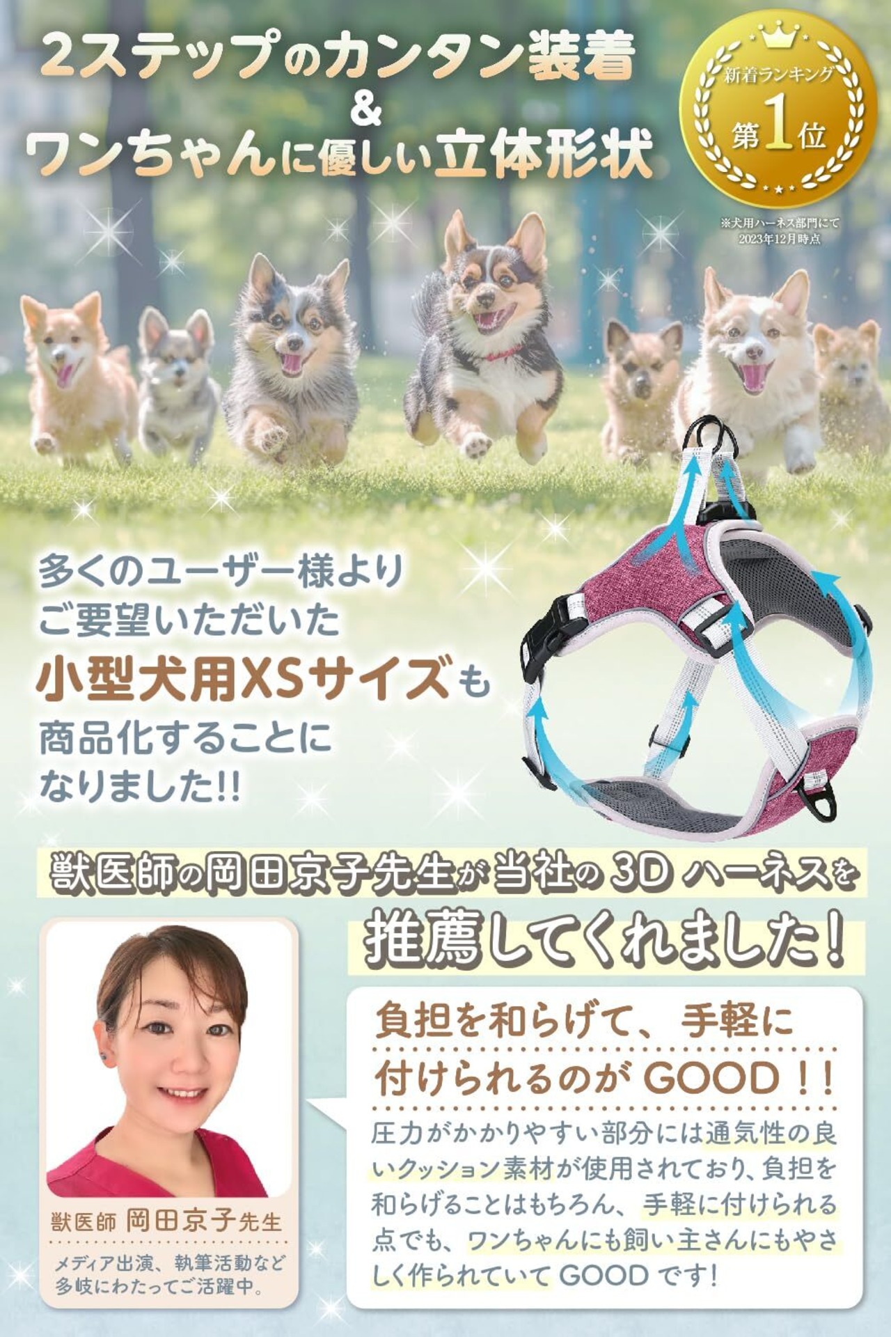【獣医師推薦】様々な従来品の不満点を改善した獣医師オススメの犬用ハーネスです。ワンちゃん、飼い主様への〝思いやり”をテーマにしたこだわり設計です。