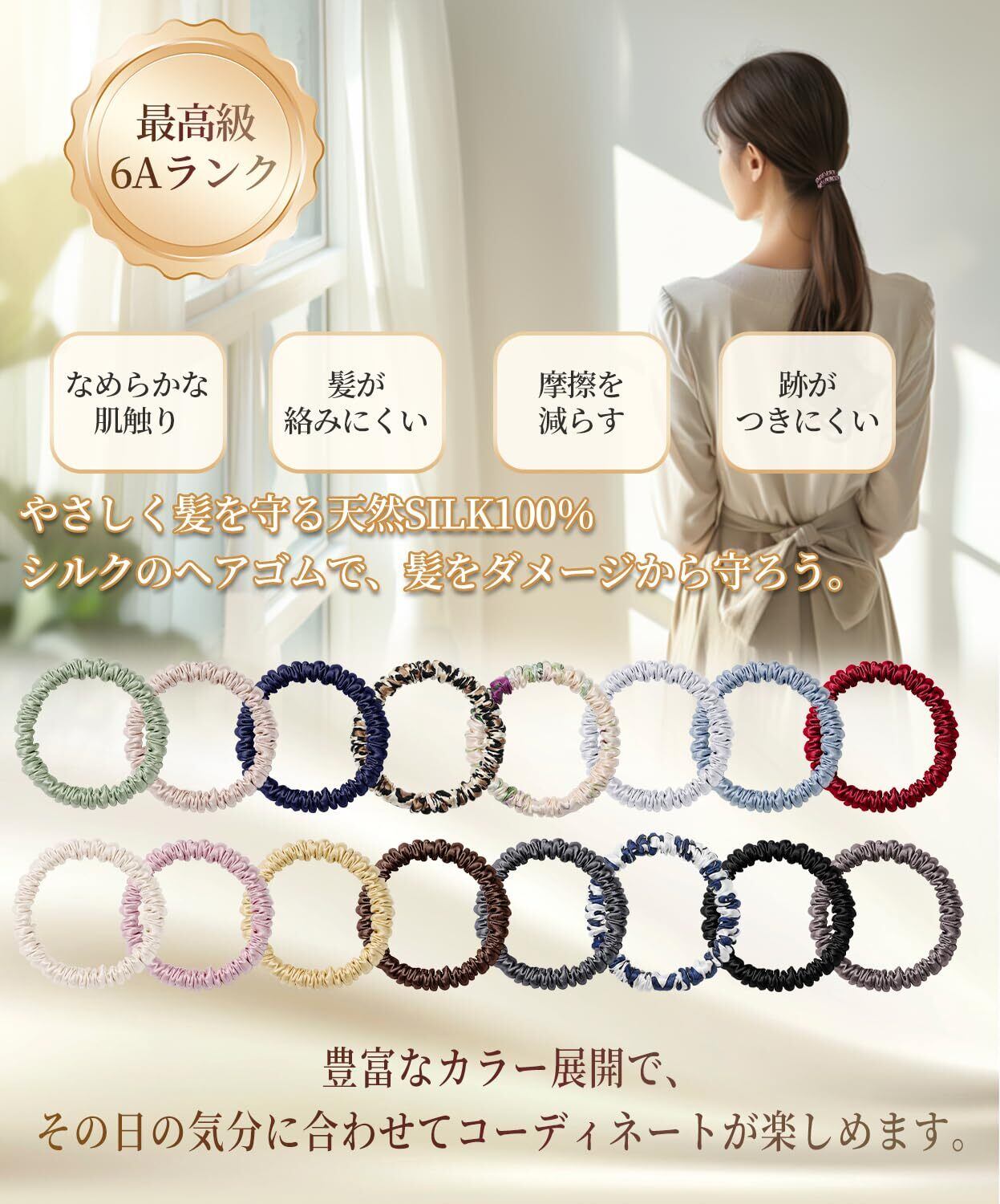 【6Aランクの最高級】:この髪ゴムは6Aランクの最高級silkを使用し、髪をまとめても跡が残りにくく、お出かけ前の準備や仕事中にちょっと髪をまとめたいときに便利です。 髪を結うだけで上質感を演出することができ、いつものまとめ髪も華やかな仕上がりになります。サンプルテストもご用意しており、安心してお買い求めいただけます。