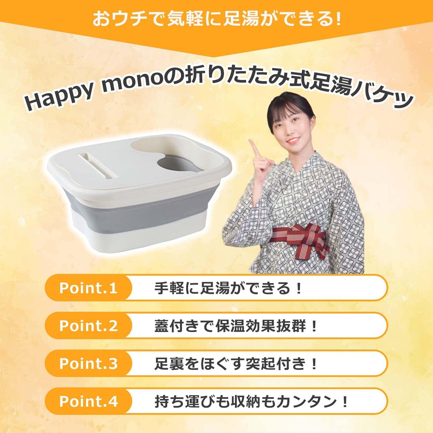 【おウチで気軽に足湯ができる!Happy monoの折りたたみ式足湯バケツ】・Point.1:手軽に足湯ができる! ・Point.2:蓋付きで保温効果抜群! ・Point.3:足裏をほぐす突起付き! ・Point.4:持ち運びも収納もカンタン!